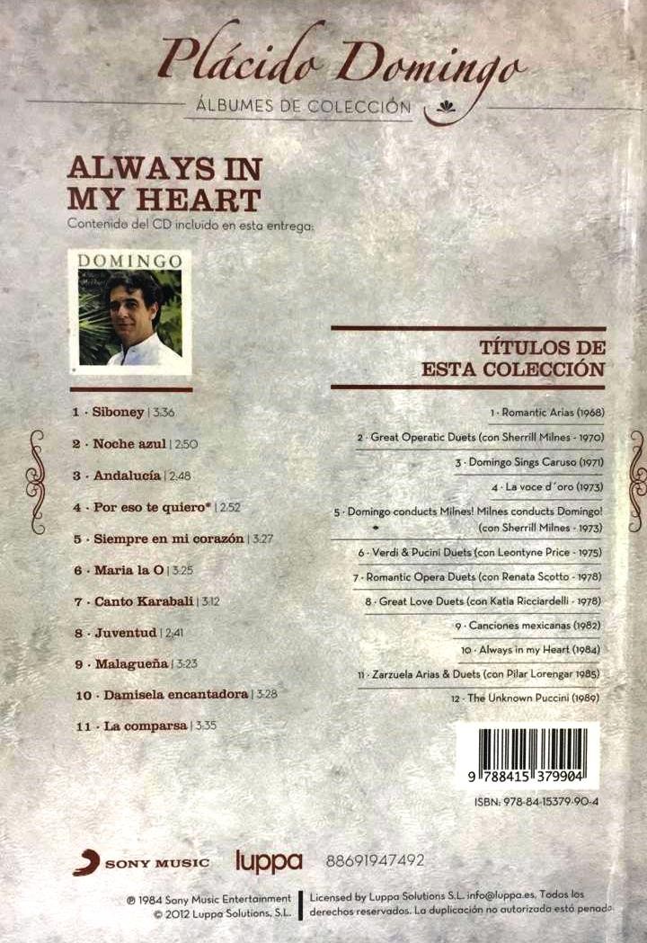 Artista(s) / Grupo: Placido Domingo | Cantidad de Discos: 1 CD + Libro | Lanzamiento: 2012 | Género(s): Jazz | Estilo(s): Jazz, Vocal, Pop | Título: Always in my heart | Artista(s) / Grupo: Placido Domingo | Cantidad de Discos: 1 CD + Libro | Lanzamiento: 2012 | Género(s): Jazz | Estilo(s): Jazz, Vocal, Pop | Título: Always in my heart
