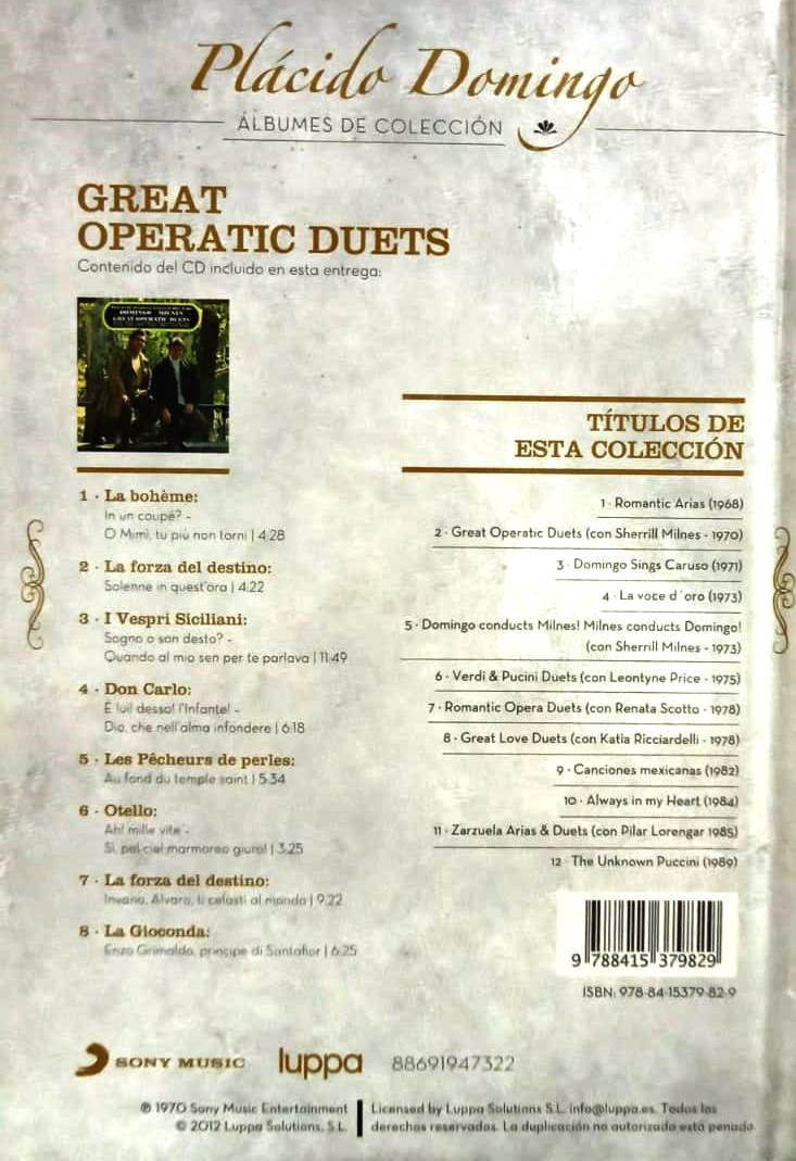 Artista(s) / Grupo: Placido Domingo | Cantidad de Discos: 1 CD + Libro | Lanzamiento: 2012 | Género(s): Clásica | Estilo(s): Classical | Título: Great Operatic Duets – album colleccion | Artista(s) / Grupo: Placido Domingo | Cantidad de Discos: 1 CD + Libro | Lanzamiento: 2012 | Género(s): Clásica | Estilo(s): Classical | Título: Great Operatic Duets – album colleccion