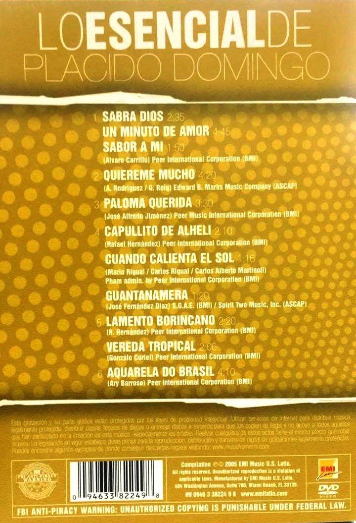 Artista(s) / Grupo: Placido Domingo | Cantidad de Discos: 1 | Lanzamiento: 2005 | Género(s): Jazz, Latin | Estilo(s): Latin | Título: Lo esencial de Placido Domingo | Artista(s) / Grupo: Placido Domingo | Cantidad de Discos: 1 | Lanzamiento: 2005 | Género(s): Jazz, Latin | Estilo(s): Latin | Título: Lo esencial de Placido Domingo