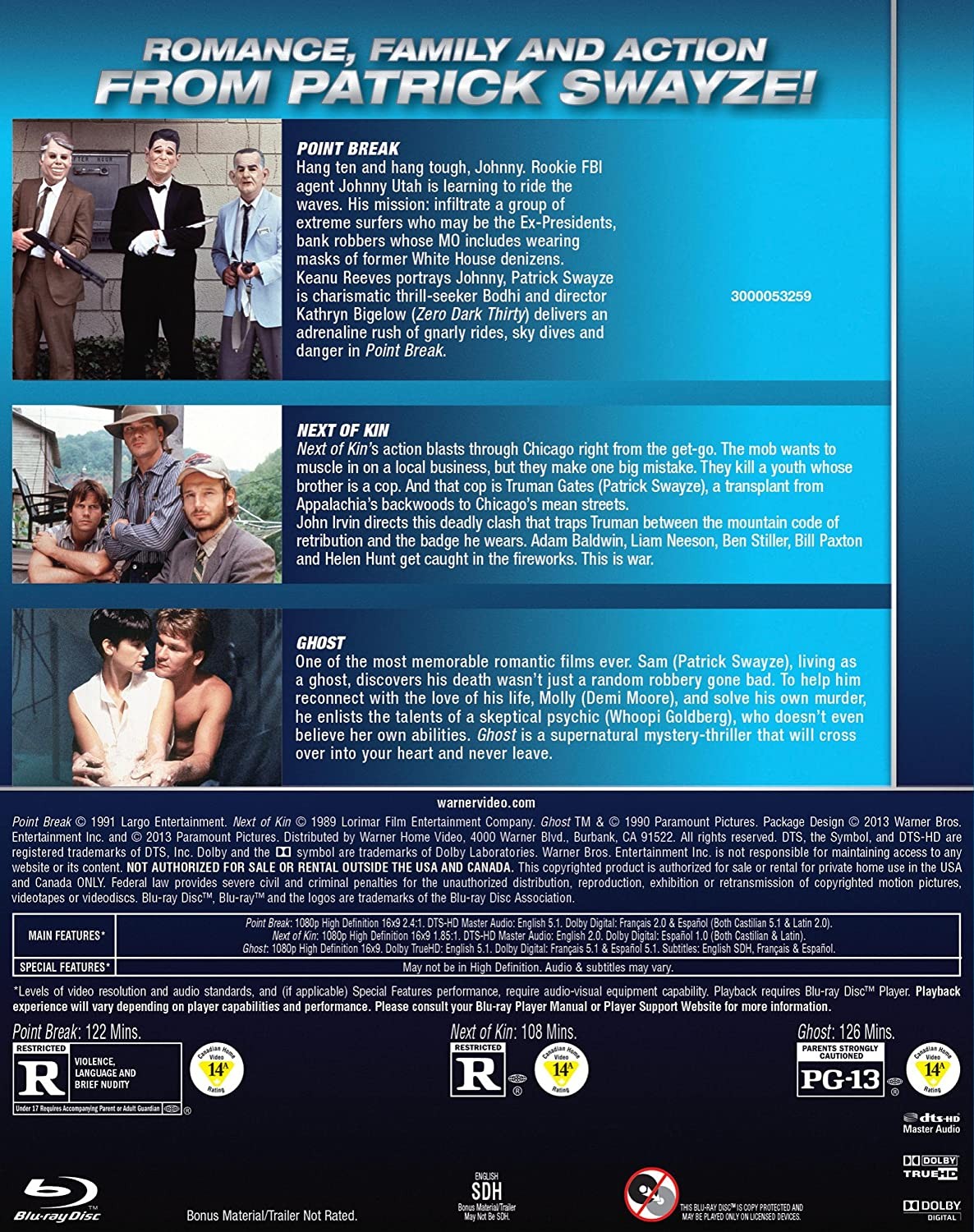 Cantidad de Discos: 3 | Lanzamiento: 2013 | Género(s): Acción. Thriller. Romance. Drama. Fantástico | Audio: Español, Inglés, Francés | SubtÃtulos: Español, Inglés, Francés | TÃtulo: Punto De Quiebra (1991) / Next Of Kin (1989) / Ghost: La Sombra Del Amor (1990) | Director(es): Kathryn Bigelow / John Irvin / Jerry Zucker | Reparto: Keanu Reeves, Patrick Swayze, Gary Busey, Lori Petty, James Legros, John Philbin, John C. McGinley, Lee Tergesen, Tom Sizemore, Mike Genovese, Bojesse Christopher, Chris Pedersen, Anthony Kiedis, Daniel Beer, Vincent Klyn, Julian Reyes, Christopher Pettiet, Sydney Walsh, Michael Kopelow, Jack Kehler, Julie Michaels, Betsy Lynn George. /