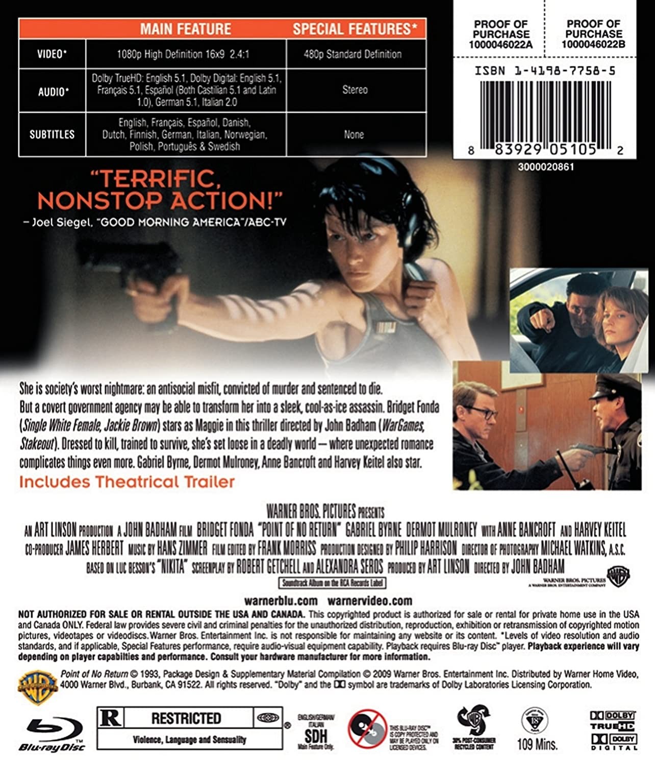 Cantidad de Discos: 1 | Lanzamiento: 1993 | Género(s): Acción | Audio: Inglés, Francés, Español | SubtÃtulos: Español, Inglés, Francés | TÃtulo: Point of No Return | Director(es): John Badham | Reparto: Bridget Fonda, Gabriel Byrne, Dermot Mulroney, Miguel Ferrer, Anne Bancroft, Harvey Keitel, Olivia d’Abo, Richard Romanus, Lorraine Toussaint, Geoffrey Lewis | Norma / Región: NTSC (Región A) | Cantidad de Discos: 1 | Lanzamiento: 1993 | Género(s): Acción | Audio: Inglés, Francés, Español | SubtÃtulos: Español, Inglés, Francés | TÃtulo: Point of No Return | Director(es): John Badham | Reparto: Bridget Fonda, Gabriel Byrne, Dermot Mulroney, Miguel Ferrer, Anne Bancroft, Harvey Keitel, Olivia d’Abo, Richard Romanus, Lorraine Toussaint, Geoffrey Lewis | Norma / Región: NTSC (Región A)