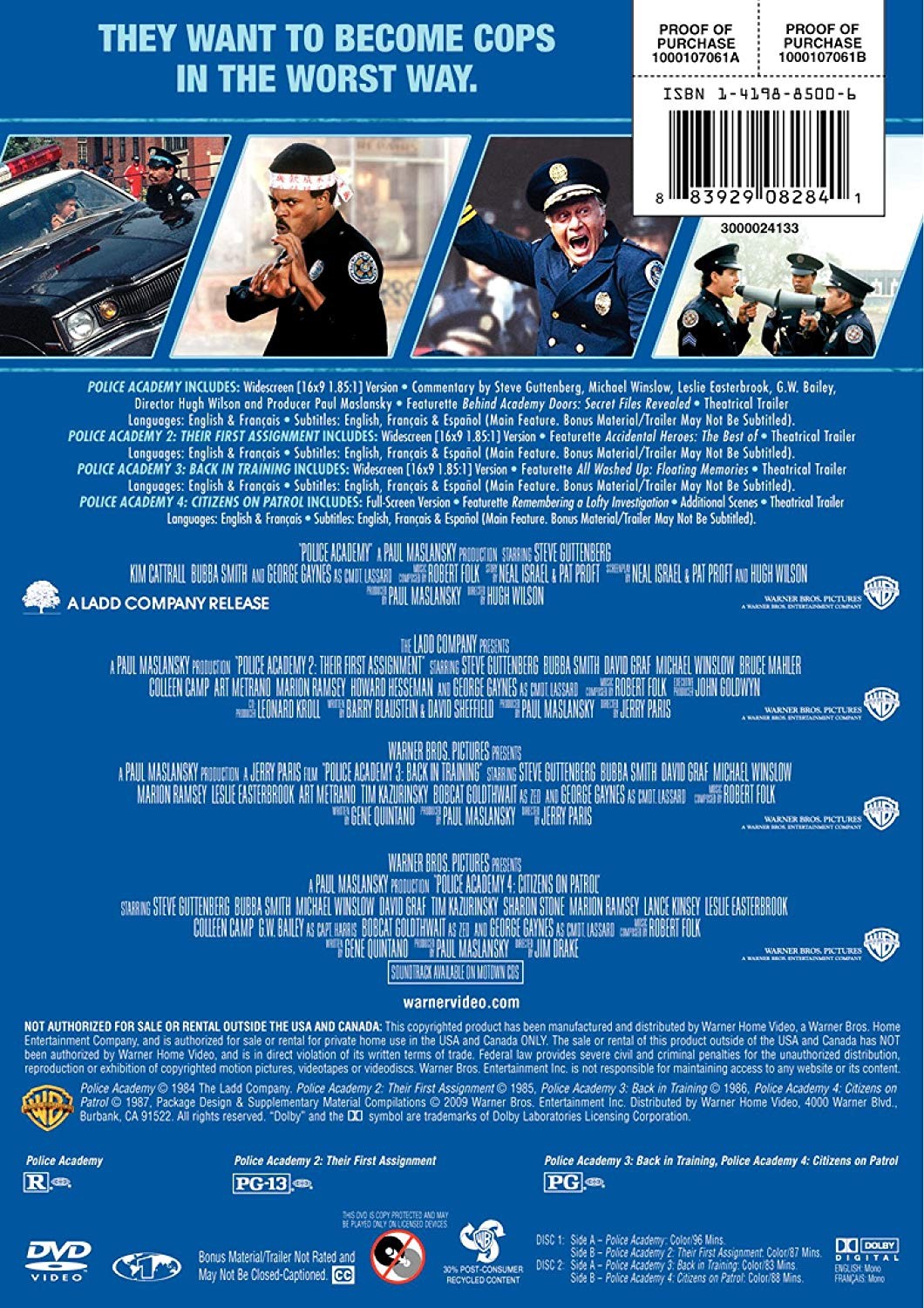 Cantidad de Discos: 2 | Lanzamiento: 2009 | Género(s): Comedia | Audio: Inglés, Francés | SubtÃtulos: Español, Inglés, Francés | TÃtulo: Police Academy, Police Academy 2, Police Academy 3, Police Academy 4 | Director(es): Hugh Wilson | Reparto: Steve Guttenberg, Kim Cattrall, G.W. Bailey, Bubba Smith, Donovan Scott, George Gaynes, Andrew Rubin, David Graf, Leslie Easterbrook, Debralee Scott | Norma / Región: 1 NTSC | Cantidad de Discos: 2 | Lanzamiento: 2009 | Género(s): Comedia | Audio: Inglés, Francés | SubtÃtulos: Español, Inglés, Francés | TÃtulo: Police Academy, Police Academy 2, Police Academy 3, Police Academy 4 | Director(es): Hugh Wilson | Reparto: Steve Guttenberg, Kim Cattrall, G.W. Bailey, Bubba Smith, Donovan Scott, George Gaynes, Andrew Rubin, David Graf, Leslie Easterbrook, Debralee Scott | Norma / Región: 1 NTSC