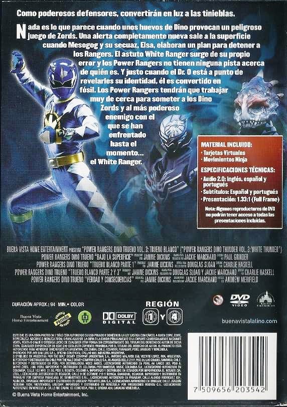 Serie de TV. 38 episodios. Un especialista en computadoras, una cantante y la estrella de fútbol de la escuela unen fuerzas para convertirse en Power Rangers. Tommy Oliver, el legendario Power Ranger trabaja como profesor de paleontologÃa en Reefside, California. Cuando tres estudiantes: Conner, Ethan y Kira descubren las Dino Gemas, son elegidos como los Power Rangers Dino Trueno. Ellos deben luchar contra Mesogog, un villano que se asemeja a un dinosaurio. Él también es el padre adoptivo del Ranger Blanco, Dr. Anton Mercer (quien también es amigo del Ranger Negro). Conner consigue al Tiranozord, volviéndose super veloz. Ethan gana la energÃa del Tricerazord y la capacidad de transformar su piel en super dura. Kira obtiene el Pterazord, asà como el pterogrito. Tommy es el Ranger Negro y controla al «Brachiozord» y tiene el poder de la invisibilidad. Y por último esta Trent es el Ranger Blanco y controla el «Dragozord» y posee la habilidad de camuflarse.