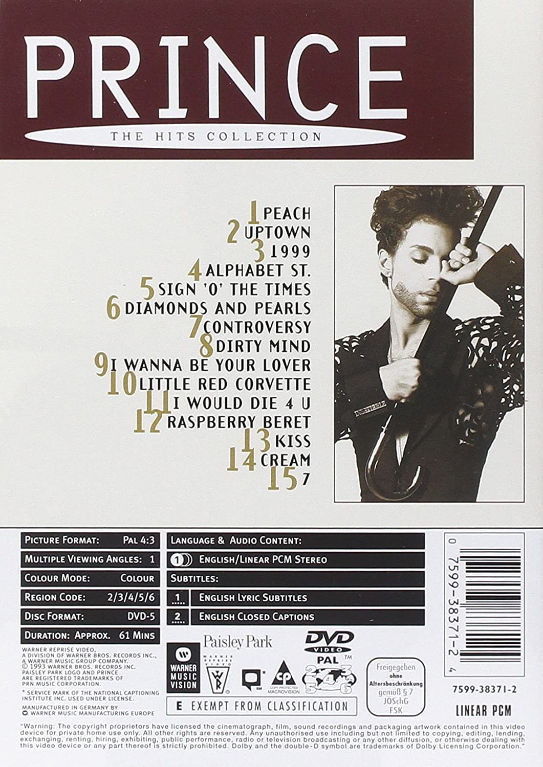 Artista(s) / Grupo: Prince | Cantidad de Discos: 1 | Lanzamiento: 1999 | Género(s): Electronic, Rock, Funk / Soul. | Estilo(s): Pop Rock, Synth-pop, Funk. | Título: The Hits Collection | Norma / Región: NTSC (Región A) | Artista(s) / Grupo: Prince | Cantidad de Discos: 1 | Lanzamiento: 1999 | Género(s): Electronic, Rock, Funk / Soul. | Estilo(s): Pop Rock, Synth-pop, Funk. | Título: The Hits Collection | Norma / Región: NTSC (Región A)