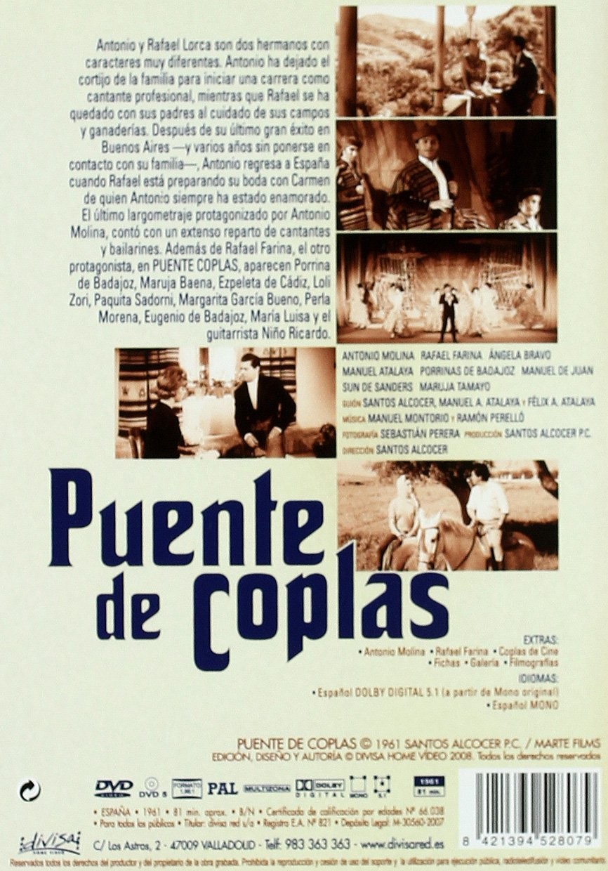 Cantidad de Discos: 1 | Lanzamiento: 2008 | Género(s): Drama | Audio: Español | Título: Puente de Coplas | Director(es): Santos Alcocer | Reparto: Antonio Molina, Rafael Farina, Manuel Atalaya, Ángela Bravo, Aurora de Alba, Manuel de Juan, Sun De Sanders, Maruja Tamayo | Norma / Región: Multizona | Cantidad de Discos: 1 | Lanzamiento: 2008 | Género(s): Drama | Audio: Español | Título: Puente de Coplas | Director(es): Santos Alcocer | Reparto: Antonio Molina, Rafael Farina, Manuel Atalaya, Ángela Bravo, Aurora de Alba, Manuel de Juan, Sun De Sanders, Maruja Tamayo | Norma / Región: Multizona