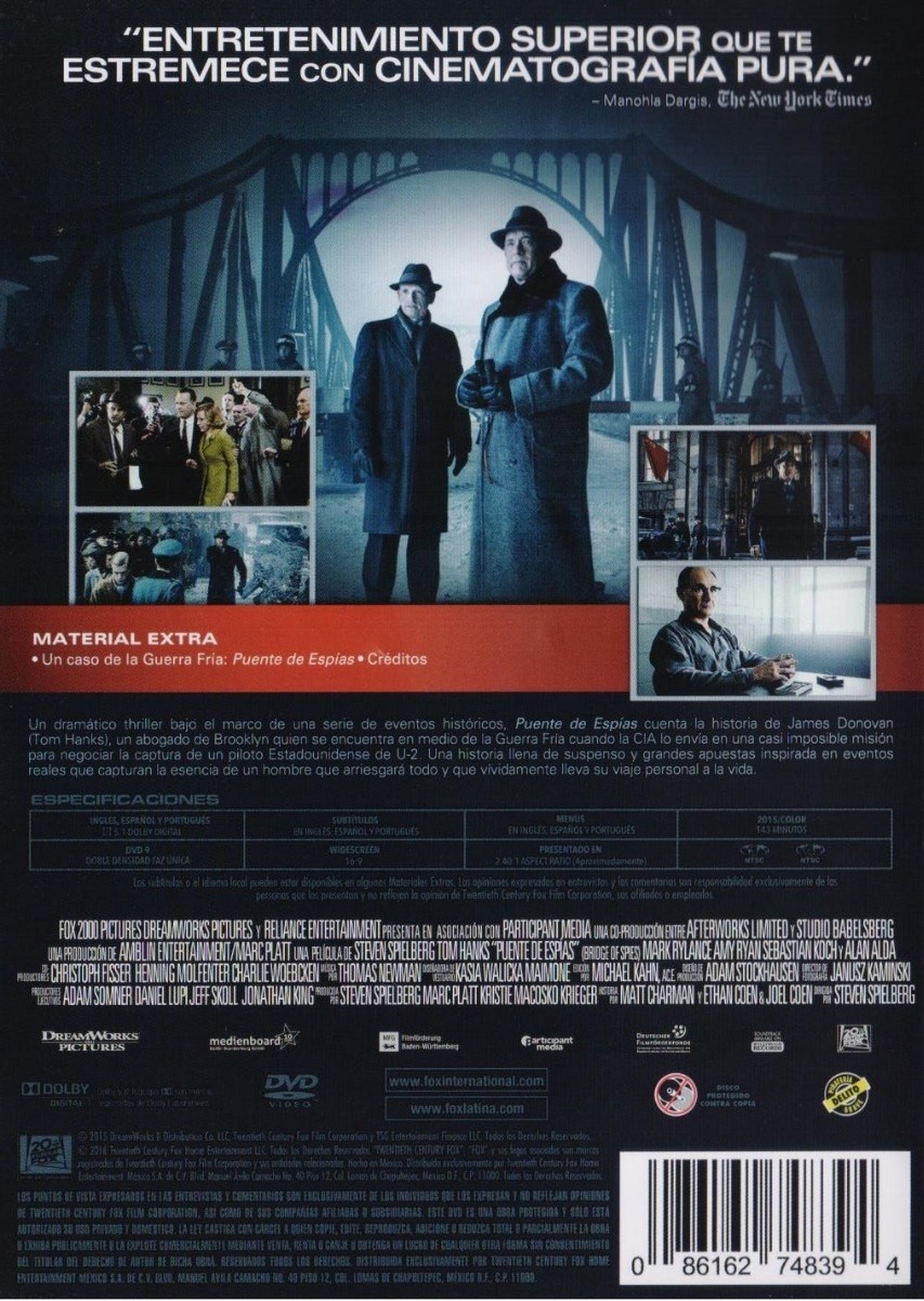 Cantidad de Discos: 1 | Lanzamiento: 2015 | Género(s): Thriller, Drama | Audio: Inglés, Portugués, Español | SubtÃtulos: Español, Inglés, Portugués | TÃtulo: Bridge of Spies | Director(es): Steven Spielberg | Reparto: Tom Hanks, Mark Rylance, Amy Ryan, Scott Shepherd, Sebastian Koch, Billy Magnussen, Alan Alda, Jesse Plemons, Eve Hewson, Peter McRobbie, Austin Stowell, Domenick Lombardozzi, Michael Gaston | Sub-CategorÃas: Biográfica | Norma / Región: NTSC (Región 1, 4) | Cantidad de Discos: 1 | Lanzamiento: 2015 | Género(s): Thriller, Drama | Audio: Inglés, Portugués, Español | SubtÃtulos: Español, Inglés, Portugués | TÃtulo: Bridge of Spies | Director(es): Steven Spielberg | Reparto: Tom Hanks, Mark Rylance, Amy Ryan, Scott Shepherd, Sebastian Koch, Billy Magnussen, Alan Alda, Jesse Plemons, Eve Hewson, Peter McRobbie, Austin Stowell, Domenick Lombardozzi, Michael Gaston | Sub-CategorÃas: Biográfica | Norma / Región: NTSC (Región 1, 4)