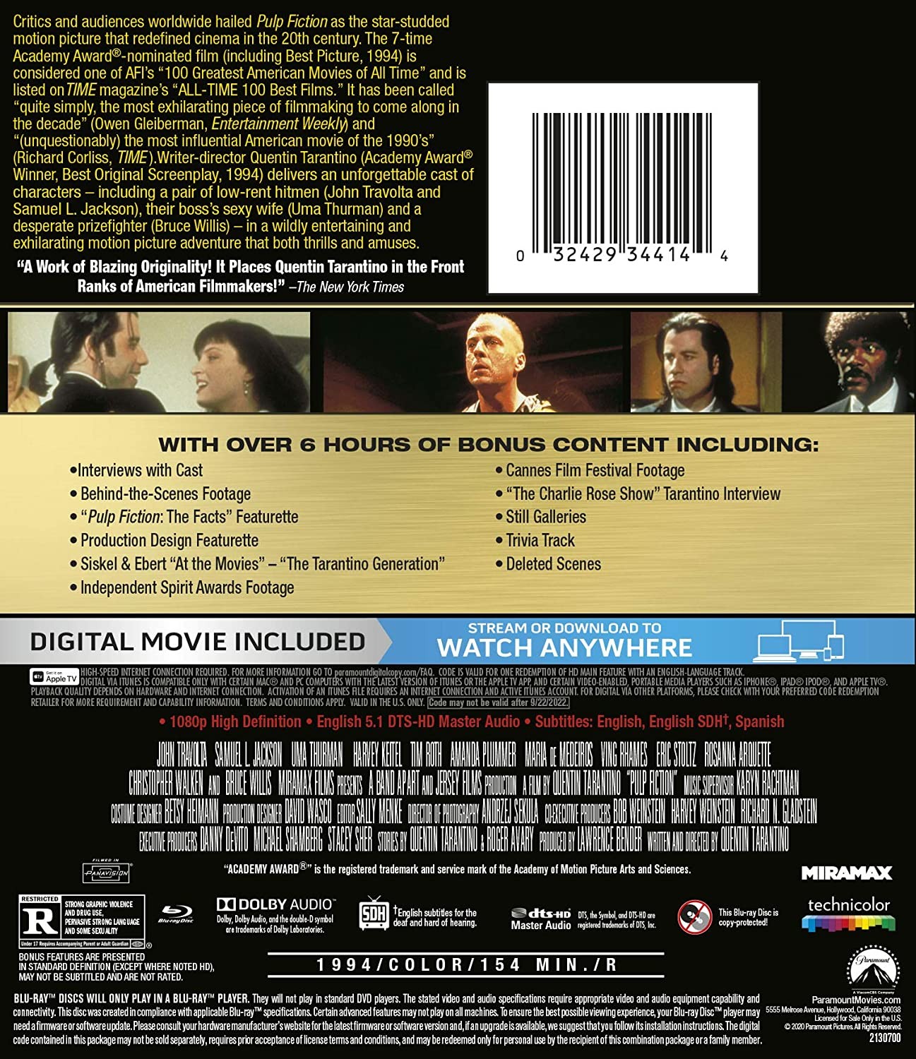 Reparto: John Travolta, Samuel L. Jackson, Uma Thurman, Bruce Willis, Ving Rhames, Harvey Keitel, Tim Roth, Amanda Plummer, MarÃa de Medeiros, Eric Stoltz, Rosanna Arquette, Christopher Walken, Paul Calderon, Bronagh Gallagher, Peter Greene, Stephen Hibbert, Angela Jones, Phil LaMarr, Robert Ruth, Julia Sweeney, Quentin Tarantino, Frank Whaley, Duane Whitaker, Steve Buscemi, Burr Steers