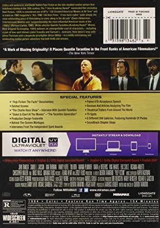 Cantidad de Discos: 2 | Lanzamiento: 1994 | Género(s): Thriller | Audio: Inglés (5,1 Dolby Digital) | SubtÃtulos: Español, Inglés | TÃtulo: Tiempos violentos | Director(es): Quentin Tarantino | Reparto: John Travolta, Samuel L. Jackson, Uma Thurman, Bruce Willis, Ving Rhames, Harvey Keitel, Tim Roth, Amanda Plummer, MarÃa de Medeiros, Eric Stoltz, Rosanna Arquette, Christopher Walken, Paul Calderon, Bronagh Gallagher, Peter Greene, Stephen Hibbert, Angela Jones, Phil LaMarr, Robert Ruth, Julia Sweeney, Quentin Tarantino, Frank Whaley, Duane Whitaker, Steve Buscemi, Burr Steers | Norma / Región: NTSC (Región 1, 4) | Cantidad de Discos: 2 | Lanzamiento: 1994 | Género(s): Thriller | Audio: Inglés (5,1 Dolby Digital) | SubtÃtulos: Español, Inglés | TÃtulo: Tiempos violentos | Director(es): Quentin Tarantino | Reparto: John Travolta, Samuel L. Jackson, Uma Thurman, Bruce Willis, Ving Rhames, Harvey Keitel, Tim Roth, Amanda Plummer, MarÃa de Medeiros, Eric Stoltz, Rosanna Arquette, Christopher Walke