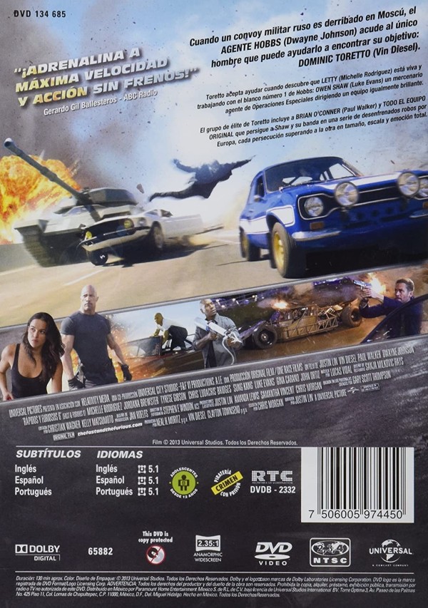 Reparto: Vin Diesel, Paul Walker, Dwayne Johnson, Jordana Brewster, Luke Evans, Gina Carano, Michelle Rodriguez, Elsa Pataky, Sung Kang, Gal Gadot, Ludacris, Tyrese Gibson, John Ortiz, Shea Whigham, David Ajala, Kim Kold, Thure Lindhardt, Joe Taslim, Rita Ora