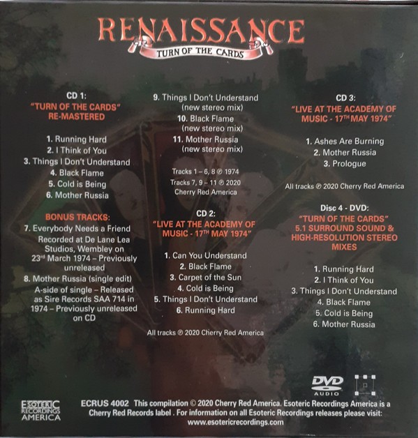 Artista(s) / Grupo: Renaissance | Cantidad de Discos: 1 DVD + 3 CD + Libro | Lanzamiento: 2020 | Género(s): Rock | Estilo(s): Prog Rock, Art Rock, Symphonic Rock | TÃtulo: Turn Of The Cards | Norma / Región: NTSC (Región A) | Artista(s) / Grupo: Renaissance | Cantidad de Discos: 1 DVD + 3 CD + Libro | Lanzamiento: 2020 | Género(s): Rock | Estilo(s): Prog Rock, Art Rock, Symphonic Rock | TÃtulo: Turn Of The Cards | Norma / Región: NTSC (Región A)