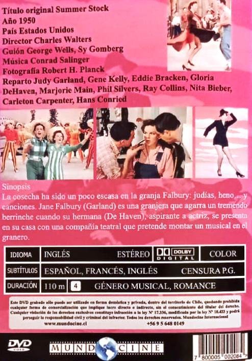 Cantidad de Discos: 1 | Lanzamiento: 2015 | Género(s): Musical. Romance | Audio: Inglés | SubtÃtulos: Español | TÃtulo: Summer Stock (If You Feel Like Singing) (1950) | Director(es): Charles Walters | Reparto: Judy Garland, Gene Kelly, Eddie Bracken, Gloria DeHaven, Marjorie Main, Phil Silvers, Ray Collins, Nita Bieber, Carleton Carpenter, Hans Conried | Norma / Región: Multizona (Disco Quemado) | Cantidad de Discos: 1 | Lanzamiento: 2015 | Género(s): Musical. Romance | Audio: Inglés | SubtÃtulos: Español | TÃtulo: Summer Stock (If You Feel Like Singing) (1950) | Director(es): Charles Walters | Reparto: Judy Garland, Gene Kelly, Eddie Bracken, Gloria DeHaven, Marjorie Main, Phil Silvers, Ray Collins, Nita Bieber, Carleton Carpenter, Hans Conried | Norma / Región: Multizona (Disco Quemado)