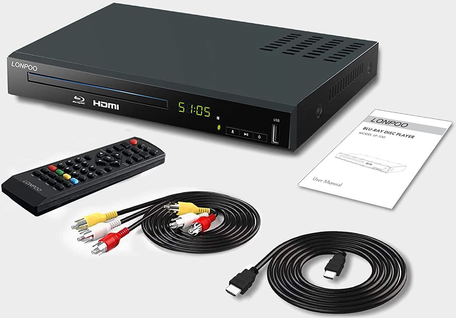 LONPOO – Reproductor de CD – DVD – Blu Ray Reproductor de disco Blu-ray Full HD con carcasa de metal, fácil conexión y fácil de usar, reproductor de DVD de cine en casa 1080P con salida HDMI, compatible con HDD y reproducción USB
