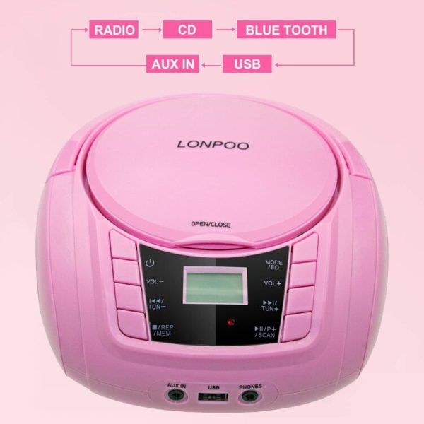 LONPOO Reproductor de CD portátil para niños, regalo Boombox, sistema de sonido estéreo clásico, altavoz al aire libre con radio FM de audio doméstico, Bluetooth, entrada auxiliar, reproducción USB, rosa