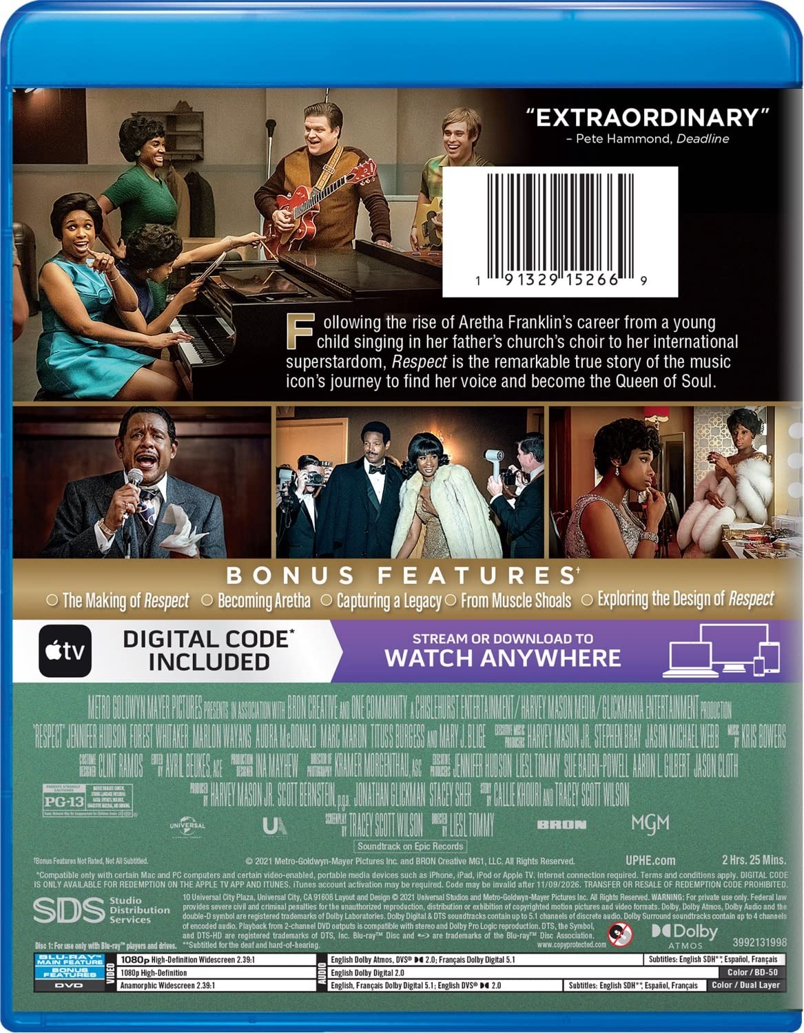 Cantidad de Discos: 1 BluRay + 1 DVD | Lanzamiento: 2021 | Género(s): Drama. Biográfico. Músical | Audio: Inglés (Dolby Digital 5,1), Español (Dolby Digital Stereo, Dolby Digital 5,1), Francés (Dolby Digital Stereo, Dolby Digital 5,1) | Subtítulos: Inglés, Español, Francés | Título: Respect: La historia de Aretha Franklin | Director(es): Liesl Tommy | Reparto: Jennifer Hudson, Leroy McClain, Forest Whitaker, Tate Donovan, Marlon Wayans, Marc Maron, Tituss Burgess, Audra McDonald, Mary J. Blige, Kimberly Scott, Joshua Mikel, Lodric D. Collins, Saycon Sengbloh, Heather Headley, Gilbert Glenn Brown, Brandon Gilpin, Skye Dakota Turner, Maurice Johnson, Audrey Williams, Damani Sease, Hailey Kilgore, Brenda Nicole Moorer, Peyton Jackson, Aba Arthur, Henry Riggs, William J. Simmons, David Simpson, Chase Burgess, Alec Barnes, Shiquita James | Norma / Región: NTSC (Región A) | Cantidad de Discos: 1 BluRay + 1 DVD | Lanzamiento: 2021 | Género(s): Drama. Biográfico. Músical | Audio: Inglés (Dolby Digita