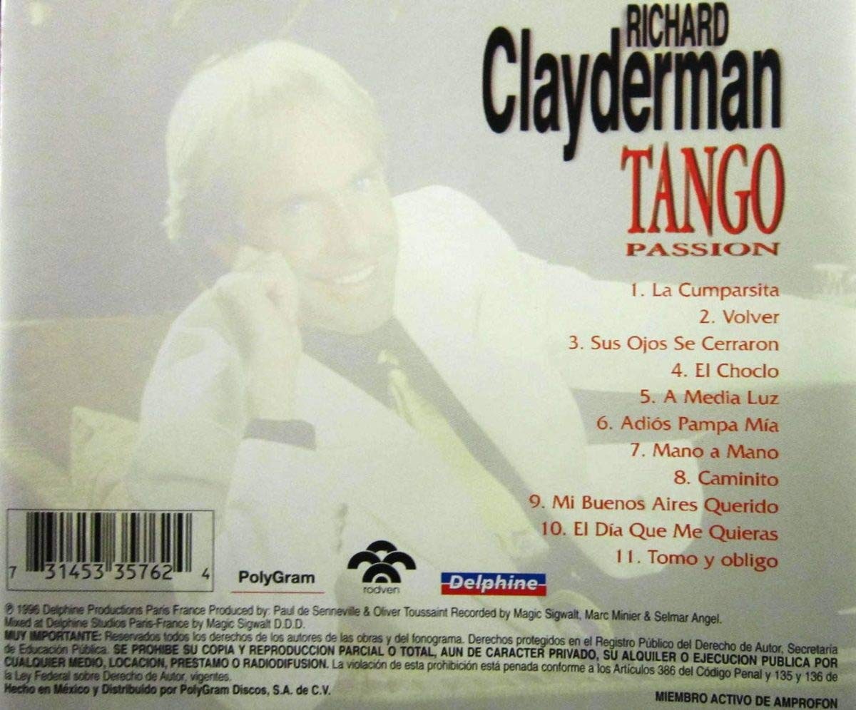 Artista(s) / Grupo: Richard Clayderman ‎ | Cantidad de Discos: 1 | Lanzamiento: 1996 | Género(s): Latin, Classical | Estilo(s): Tango, Easy Listening | Título: Tango Passion | Artista(s) / Grupo: Richard Clayderman ‎ | Cantidad de Discos: 1 | Lanzamiento: 1996 | Género(s): Latin, Classical | Estilo(s): Tango, Easy Listening | Título: Tango Passion