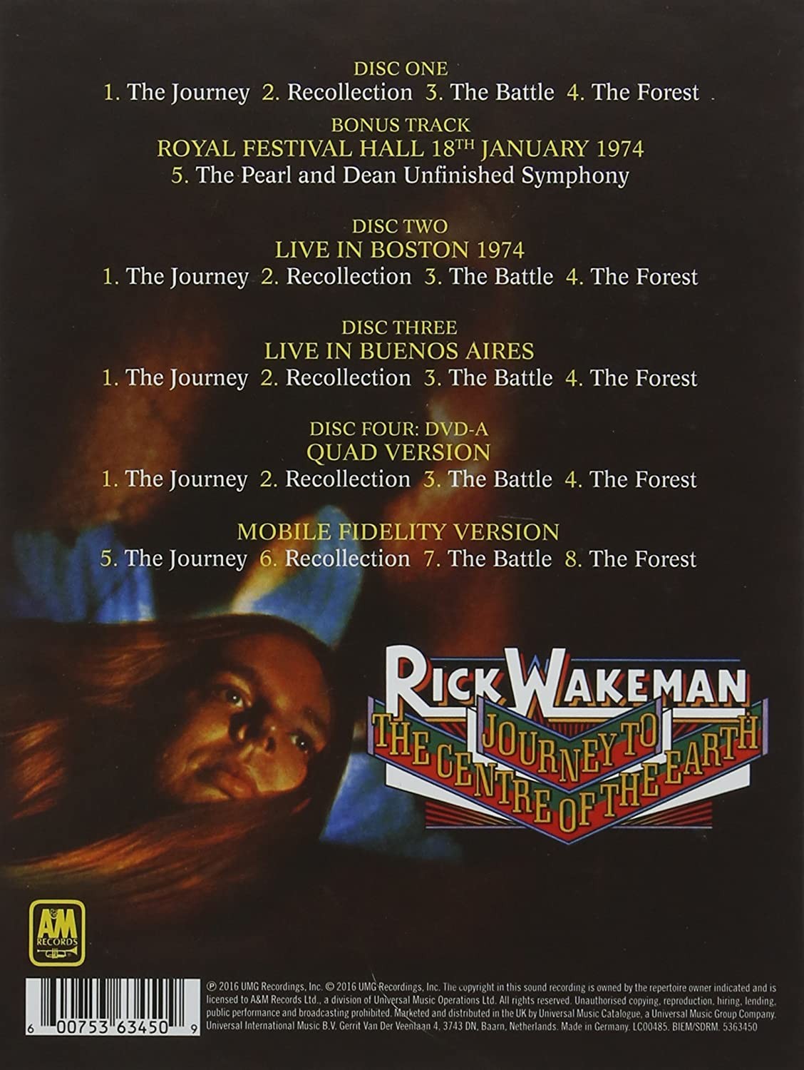 Artista(s) / Grupo: Rick Wakeman | Cantidad de Discos: 1 DVD + 3 CD | Lanzamiento: 2016 | Género(s): Electronic, Rock. | Estilo(s): Modern Classical, Prog Rock, Symphonic Rock. | TÃtulo: Journey To The Centre Of The Earth | Norma / Región: PAL (Región 2) | Artista(s) / Grupo: Rick Wakeman | Cantidad de Discos: 1 DVD + 3 CD | Lanzamiento: 2016 | Género(s): Electronic, Rock. | Estilo(s): Modern Classical, Prog Rock, Symphonic Rock. | TÃtulo: Journey To The Centre Of The Earth | Norma / Región: PAL (Región 2)