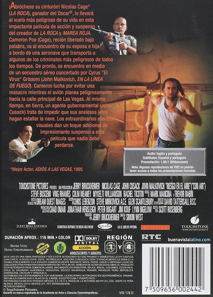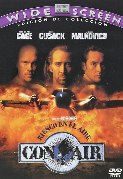 | Norma / Región: NTSC (Región 1, 4) | Cantidad de Discos: 1 | Lanzamiento: 1997 | Género(s): Acción | Audio: Inglés, Portugués | Subtítulos: Español, Portugués | Título: Con Air | Director(es): Simon West | Reparto: Nicolas Cage, John Cusack, John Malkovich, Steve Buscemi, Ving Rhames, Colm Meaney, Rachel Ticotin, Mykelti Williamson, Monica Potter, Angela Featherstone, José Zúñiga, Dave Chappelle, Danny Trejo, Nick Chinlund, Landry Allbright, M.C. Gainey