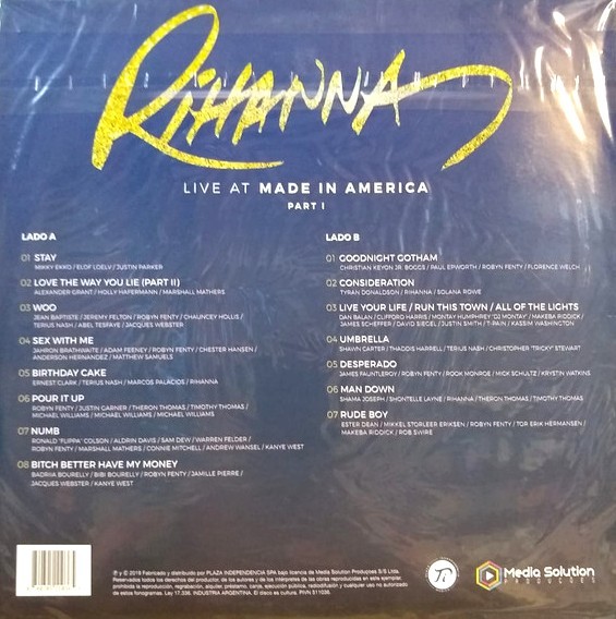 Artista(s) / Grupo: Rihanna | Cantidad de Discos: 1 LP | Lanzamiento: 2013 | Género(s): Electronic, Pop | TÃtulo: Live At Made In America Part 1 | Artista(s) / Grupo: Rihanna | Cantidad de Discos: 1 LP | Lanzamiento: 2013 | Género(s): Electronic, Pop | TÃtulo: Live At Made In America Part 1