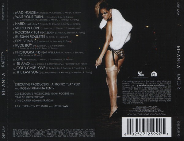 Artista(s) / Grupo: Rihanna | Cantidad de Discos: 1 CD | Lanzamiento: 2009 | Género(s): Electronic, Hip Hop, Funk / Soul, Pop | Estilo(s): Downtempo, Contemporary R&B, RnB/Swing, Synth-pop | TÃtulo: Rated R | Artista(s) / Grupo: Rihanna | Cantidad de Discos: 1 CD | Lanzamiento: 2009 | Género(s): Electronic, Hip Hop, Funk / Soul, Pop | Estilo(s): Downtempo, Contemporary R&B, RnB/Swing, Synth-pop | TÃtulo: Rated R