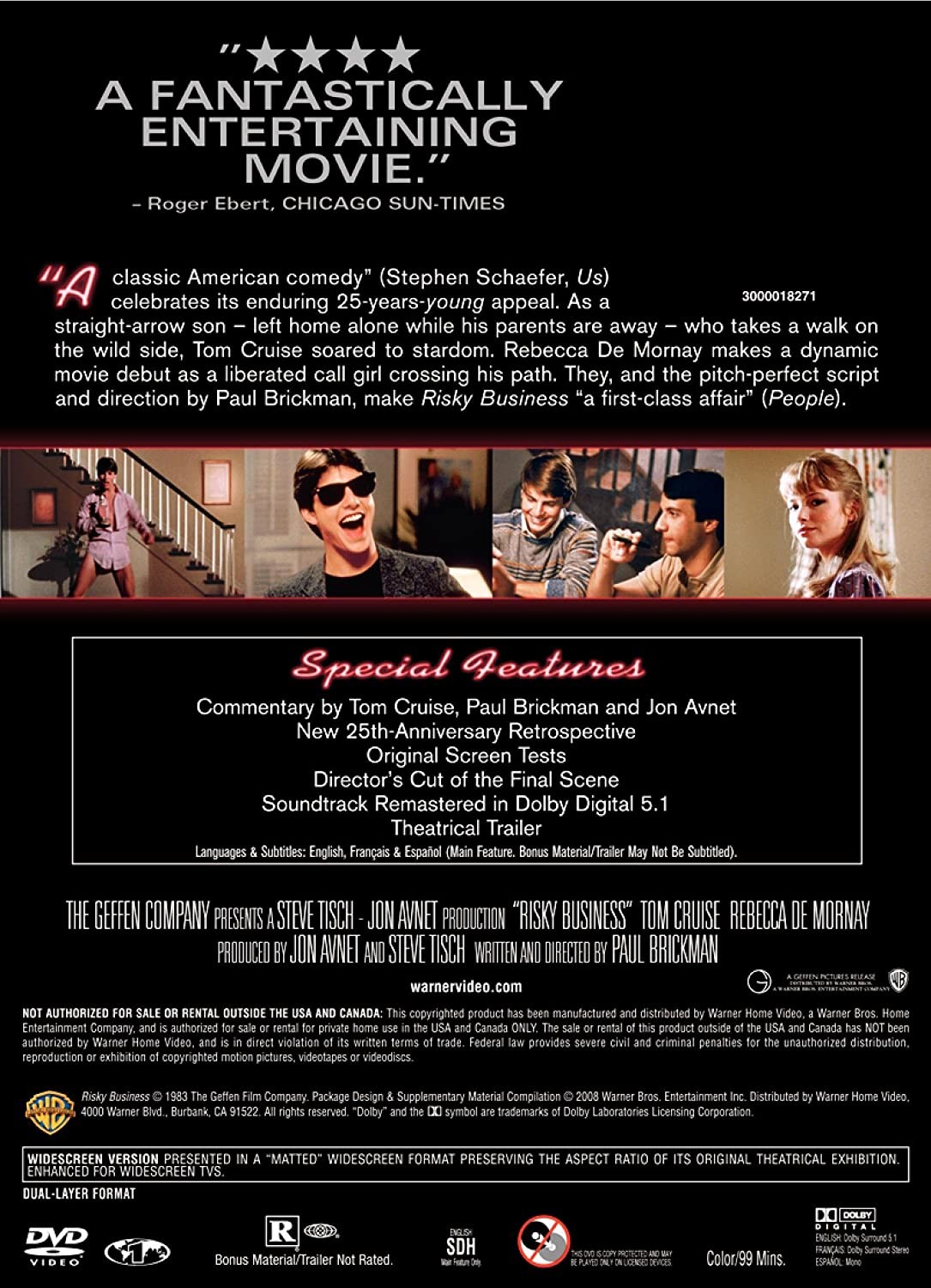 Cantidad de Discos: 1 | Lanzamiento: 2004 | Género(s): Drama. Comedia. | Audio: Inglés (Dolby Digital 5,1), Español (Dolby Digital Stereo, Dolby Digital 5,1), Francés (Dolby Digital Stereo, Dolby Digital 5,1) | Subtítulos: Español, Inglés, Francés | Título: Negocios Riesgosos (1983) | Director(es): Paul Brickman. | Reparto: Tom Cruise, Rebecca De Mornay, Joe Pantoliano, Richard Masur, Bronson Pinchot, Nicholas Pryor, Janet Carroll, Curtis Armstrong, Shera Danese, Raphael Sbarge, Bruce A. Young, Kevin Anderson, Nathan Davis, Jerome Landfield, Ron Dean, Bruno Alexander, Robert Kurcz, Jonathan Chapin, Harry Teinowitz, Francine Locke, Debra Dulman, Megan Mullally, Lora Staley, Fern Persons, Cynthia Baker, Wayne Kneeland, Karen Grossman, Brett Baer, Vinny Argiro, Mike Genovese | Norma / Región: NTSC 1 | Cantidad de Discos: 1 | Lanzamiento: 2004 | Género(s): Drama. Comedia. | Audio: Inglés (Dolby Digital 5,1), Español (Dolby Digital Stereo, Dolby Digital 5,1), Francés (Dolby Digital Stereo, Dolby Digi