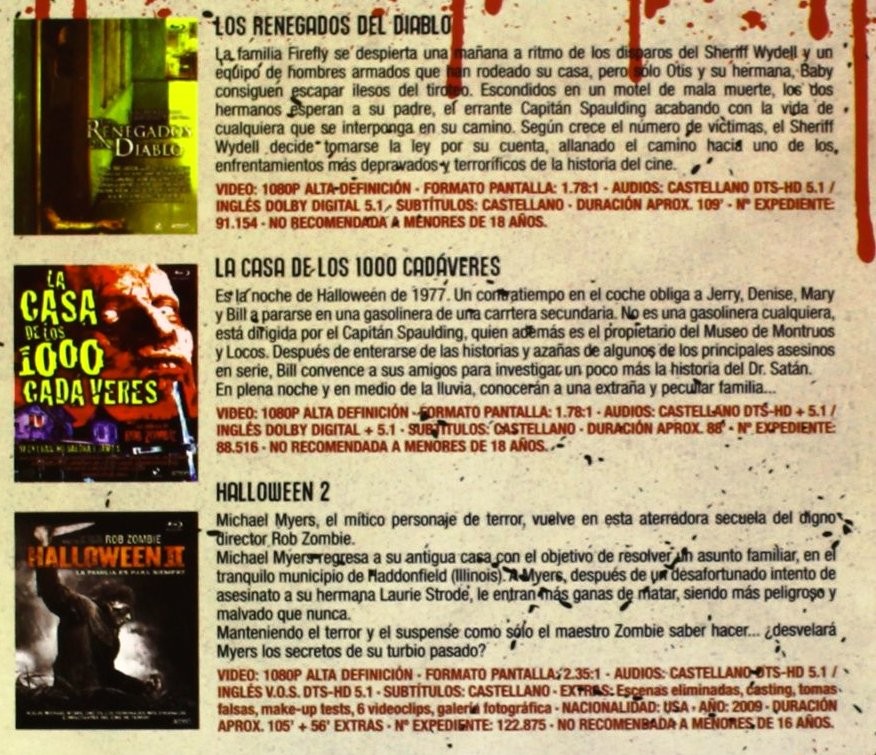 Cantidad de Discos: 3 | Lanzamiento: 2017 | Género(s): Terror | Audio: Español (Dolby Digital 2.0), Inglés (Dolby Digital 2.0) | Subtítulos: Español, Inglés | Título: The Devil’s Rejects (2005) / House of 1000 Corpses (2003) / Halloween II (1981) | Director(es): Rob Zombie / Rob Zombie / Rick Rosenthal | Reparto: Sid Haig, Sheri Moon Zombie, Bill Moseley, William Forsythe, Matthew McGrory, Leslie Easterbrook, Tyler Mane, Michael Berryman, Danny Trejo, Ken Foree, Geoffrey Lewis, Dave Sheridan, Diamond Dallas Page, Priscilla Barnes /