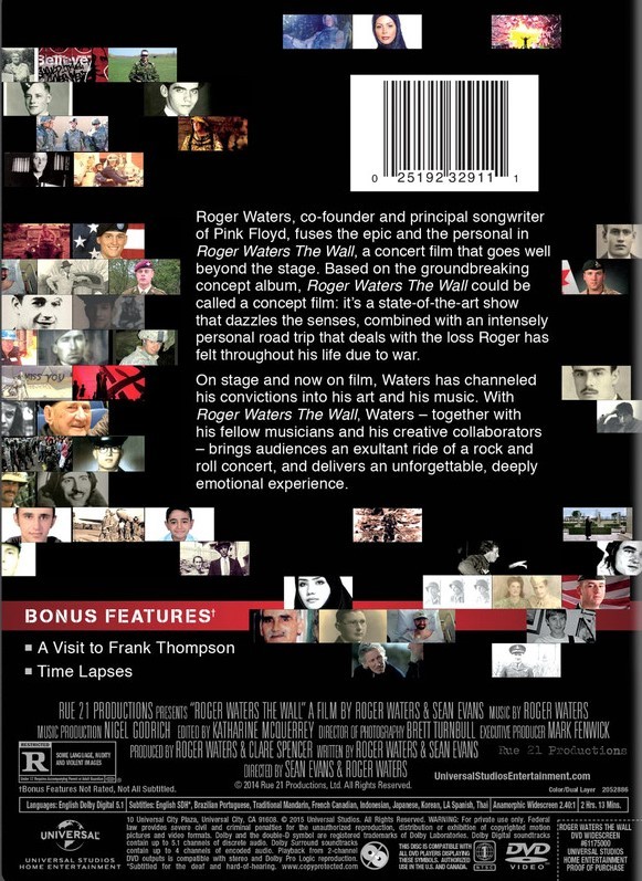 | Reparto: Roger Waters, Dave Kilminster, Snowy White, G.E. Smith, Jon Carin, Harry Waters, Graham Broad, Robbie Wycoff, Jon Joyce, Pat Lennon, Mark Lennon, Kipp Lennon | Norma / Región: NTSC 1 | Artista(s) / Grupo: Roger Waters | Cantidad de Discos: 1 | Lanzamiento: 2014 | Género(s): Documental, Musical | Audio: Inglés (Dolby Digital 5,1) | Subtítulos: Inglés, Español, Francés, Portugués | Título: The wall | Director(es): Sean Evans, Roger Waters