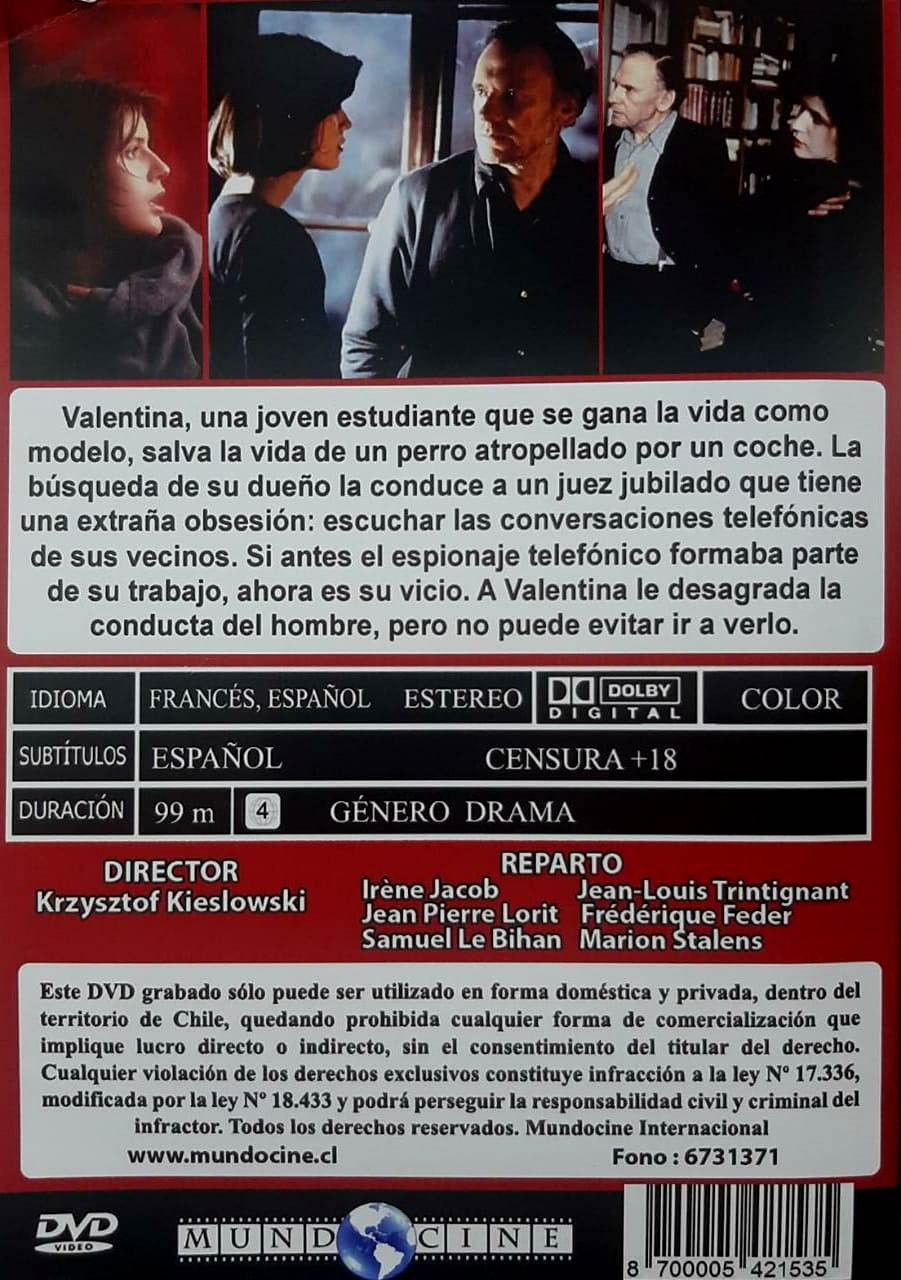 Cantidad de Discos: 1 DVD | Lanzamiento: 1994 | Género(s): Drama | Audio: Español (Dolby Digital), Francés (Dolby Digital) | SubtÃtulos: Español | TÃtulo: Trois couleurs: Rouge o Three Colours: Red | Director(es): Krzysztof KieÅ›lowski | Reparto: Irène Jacob, Jean-Louis Trintignant, Jean-Pierre Lorit, Frédérique Feder, Samuel Le Bihan, Marion Stalens, Cécile Tanner, Juliette Binoche, Julie Delpy, Benoît Régent, Zbigniew Bielawski | Norma / Región: Multizona (Disco Quemado) | Cantidad de Discos: 1 DVD | Lanzamiento: 1994 | Género(s): Drama | Audio: Español (Dolby Digital), Francés (Dolby Digital) | SubtÃtulos: Español | TÃtulo: Trois couleurs: Rouge o Three Colours: Red | Director(es): Krzysztof KieÅ›lowski | Reparto: Irène Jacob, Jean-Louis Trintignant, Jean-Pierre Lorit, Frédérique Feder, Samuel Le Bihan, Marion Stalens, Cécile Tanner, Juliette Binoche, Julie Delpy, Benoît Régent, Zbigniew Bielawski | Norma / Región: Multizona (Disco Quemado)