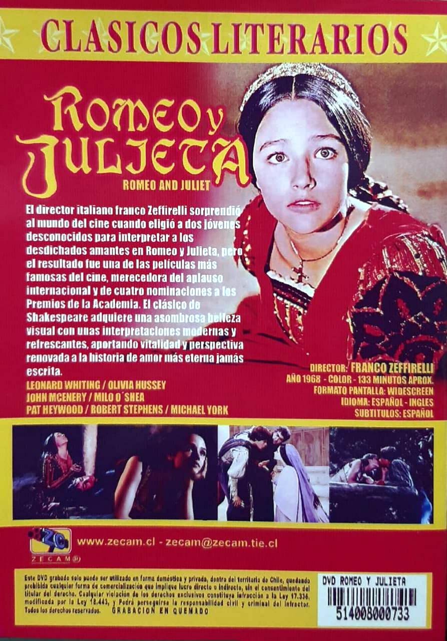 Cantidad de Discos: 1 | Lanzamiento: 2010 | Género(s): Drama, Romance | Audio: Español, Inglés | SubtÃtulos: Español | TÃtulo: Romeo and Juliet (1968) | Director(es): Franco Zeffirelli | Reparto: Leonard Whiting, Olivia Hussey, John McEnery, Michael York, Pat Heywood, Milo O’Shea, Paul Hardwick, Natasha Parry, Bruce Robinson, Antonio Pierfederici, Esmeralda Ruspoli, Robert Stephens, Roberto Bisacco | Norma / Región: Multizona (Disco quemado) | Cantidad de Discos: 1 | Lanzamiento: 2010 | Género(s): Drama, Romance | Audio: Español, Inglés | SubtÃtulos: Español | TÃtulo: Romeo and Juliet (1968) | Director(es): Franco Zeffirelli | Reparto: Leonard Whiting, Olivia Hussey, John McEnery, Michael York, Pat Heywood, Milo O’Shea, Paul Hardwick, Natasha Parry, Bruce Robinson, Antonio Pierfederici, Esmeralda Ruspoli, Robert Stephens, Roberto Bisacco | Norma / Región: Multizona (Disco quemado)