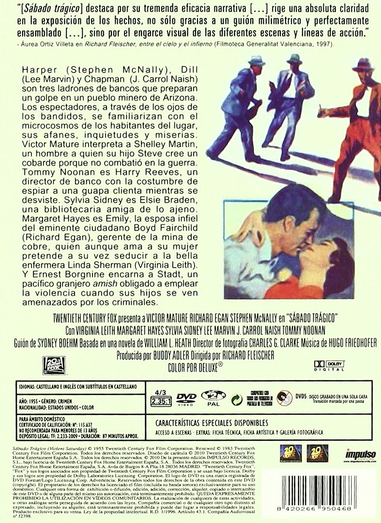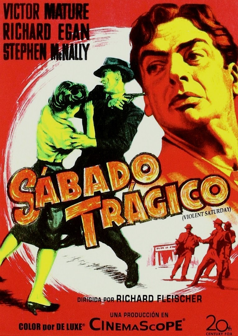 Cantidad de Discos: 1 | Lanzamiento: 2010 | Género(s): Thriller, Drama | Audio: Español, Inglés | SubtÃtulos: Español | TÃtulo: Violent Saturday (1955) | Director(es): Richard Fleischer | Reparto: Victor Mature, Richard Egan, Stephen McNally, Lee Marvin, Ernest Borgnine, Virginia Leith, Tommy Noonan, Margaret Hayes, J. Carrol Naish, Sylvia Sidney, Billy Chapin, Dorothy Patrick | Norma / Región: PAL (Región 2) | Cantidad de Discos: 1 | Lanzamiento: 2010 | Género(s): Thriller, Drama | Audio: Español, Inglés | SubtÃtulos: Español | TÃtulo: Violent Saturday (1955) | Director(es): Richard Fleischer | Reparto: Victor Mature, Richard Egan, Stephen McNally, Lee Marvin, Ernest Borgnine, Virginia Leith, Tommy Noonan, Margaret Hayes, J. Carrol Naish, Sylvia Sidney, Billy Chapin, Dorothy Patrick | Norma / Región: PAL (Región 2)