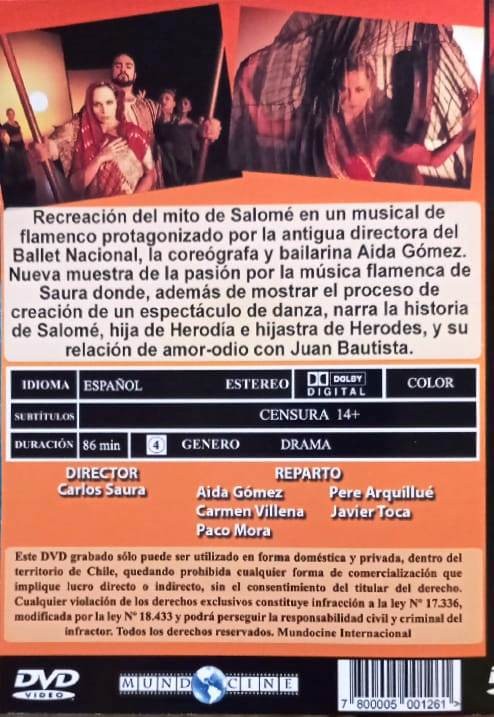 Cantidad de Discos: 1 | Lanzamiento: 2010 | Género(s): Musical | Teatro | Audio: Español | SubtÃtulos: Español | TÃtulo: Salomé (2002) | Director(es): Carlos Saura | Reparto: Aida Gómez, Carmen Villena, Javier Toca, Pere Arquillué, Paco Mora, Cecilia Rivera, Pilar Arteseros | Norma / Región: Multizona (Disco Quemado) | Cantidad de Discos: 1 | Lanzamiento: 2010 | Género(s): Musical | Teatro | Audio: Español | SubtÃtulos: Español | TÃtulo: Salomé (2002) | Director(es): Carlos Saura | Reparto: Aida Gómez, Carmen Villena, Javier Toca, Pere Arquillué, Paco Mora, Cecilia Rivera, Pilar Arteseros | Norma / Región: Multizona (Disco Quemado)