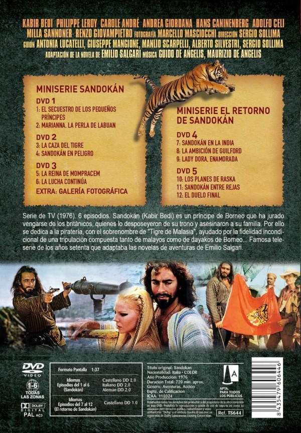 Cantidad de Discos: 5 | Lanzamiento: 2010 | Género(s): Serie de TV, Aventuras, Acción, Drama | Audio: Español (Dolby Digital 2,0) | TÃtulo: Sandokan (1976) / Il ritorno di Sandokan (1996) | Director(es): Sergio Sollima / Enzo G. Castellari | Reparto: Kabir Bedi, Philippe Leroy, Carole André, Andrea Giordana, Hans Caninenberg, Adolfo Celi, Milla Sannoner, Renzo Giovampietro /