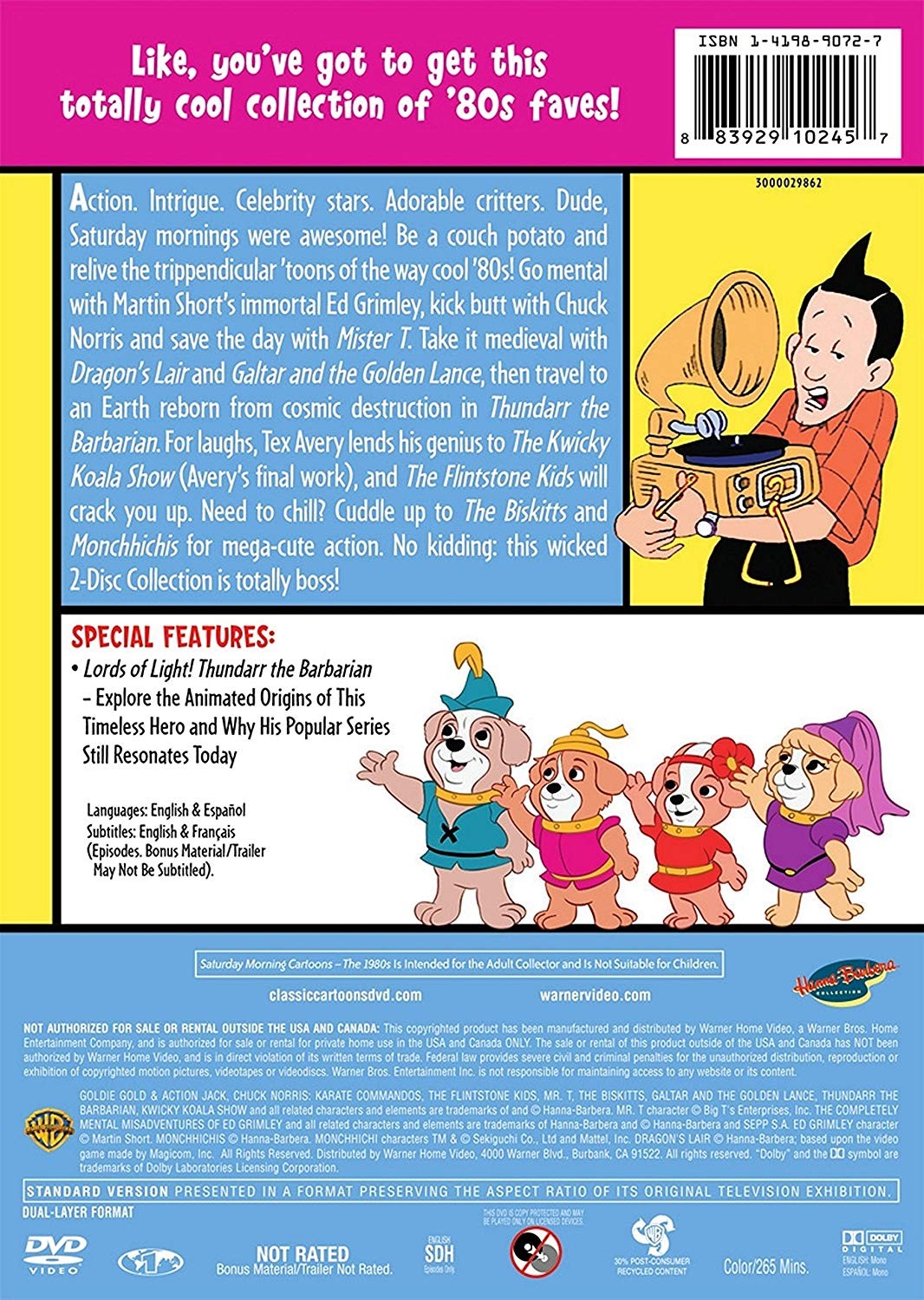 Acción. Intriga. Estrellas de la celebridad. Criaturas adorables. Los sábados por la mañana eran increíbles! ¡Conviértete en un adicto a la televisión y revive los triciclos ‘toons’ de la manera en que los ’80 se han enfriado! Mentale con el inmortal Ed Grimley de Martin Short, patee a tope con Chuck Norris y salve el día con Mister T. Tómelo medieval con Dragon’s Lair y Galtar and Golden Lance, luego viaje a una Tierra renacida de la destrucción cósmica en Thundarr the Barbarian. Para las risas, Tex Avery presta su genio a The Kwicky Koala Show (el trabajo final de Avery y los Flintstones Kids te harán reír. ¿Necesitas relajarte? Acurrúcate en The Biskitts and Monchhichis para una acción mega-linda. No es broma: esta malvada 2 -Disc Collection es totalmente jefe!