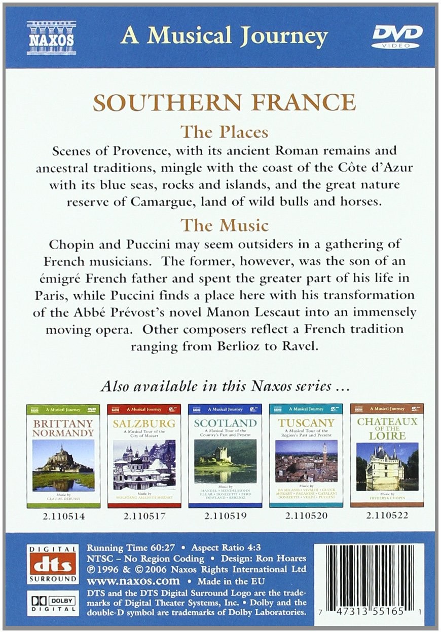 Cantidad de Discos: 1 | Lanzamiento: 2012 | Género(s): Documental | Audio: Inglés, Francés, Español | SubtÃtulos: Español, Inglés, Francés | TÃtulo: Naxos Scenic Musical Journeys Southern France A Musical Tour of Provence, Cote d’Azur and Camargue | Director(es): Adriano | Norma / Región: NTSC 1 | Cantidad de Discos: 1 | Lanzamiento: 2012 | Género(s): Documental | Audio: Inglés, Francés, Español | SubtÃtulos: Español, Inglés, Francés | TÃtulo: Naxos Scenic Musical Journeys Southern France A Musical Tour of Provence, Cote d’Azur and Camargue | Director(es): Adriano | Norma / Región: NTSC 1