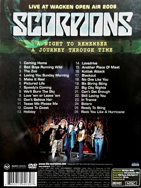 Artista(s) / Grupo: Scorpions | Cantidad de Discos: 1 | Lanzamiento: 2007 | Género(s): Rock | Estilo(s): Hard Rock, Heavy Metal | Título: Live At Wacken Open Air 2006 | Norma / Región: NTSC (Región 1, 4) | Artista(s) / Grupo: Scorpions | Cantidad de Discos: 1 | Lanzamiento: 2007 | Género(s): Rock | Estilo(s): Hard Rock, Heavy Metal | Título: Live At Wacken Open Air 2006 | Norma / Región: NTSC (Región 1, 4)