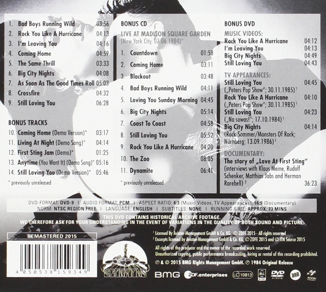 | DVD-9 | The Story of «Love At The First Sting» (Interview With Klaus Meine, Rudolf Schenker, Matthias Jabs And Herman Rarebell) | 36:23 |