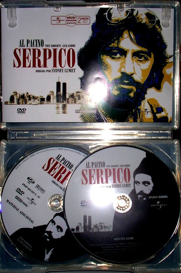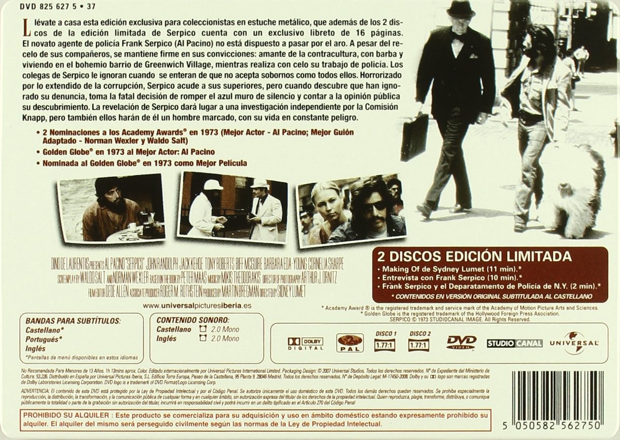 Cantidad de Discos: 2 DVD + Steelbook | Lanzamiento: 2008 | Género(s): Drama | Audio: Español (Dolby Digital 2.0), Inglés (Dolby Digital 2.0) | SubtÃtulos: Español, Inglés, Portugués | TÃtulo: Serpico (1973) | Director(es): Sydney Lumet | Reparto: Al Pacino, John Randolph, Jack Kehoe, Tony Roberts, Biff McGuire, Cornelia Sharpe, Barbara Eda-Young, John Medici, Allan Rich, Ed Grover, Judd Hirsch | Norma / Región: PAL (Región 2) | Cantidad de Discos: 2 DVD + Steelbook | Lanzamiento: 2008 | Género(s): Drama | Audio: Español (Dolby Digital 2.0), Inglés (Dolby Digital 2.0) | SubtÃtulos: Español, Inglés, Portugués | TÃtulo: Serpico (1973) | Director(es): Sydney Lumet | Reparto: Al Pacino, John Randolph, Jack Kehoe, Tony Roberts, Biff McGuire, Cornelia Sharpe, Barbara Eda-Young, John Medici, Allan Rich, Ed Grover, Judd Hirsch | Norma / Región: PAL (Región 2) | Cantidad de Discos: 2 DVD + Steelbook | Lanzamiento: 2008 | Género(s): Drama | Audio: Español (Dolby Digital 2.0), Ingl