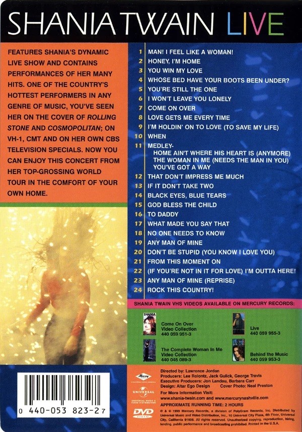 Artista(s) / Grupo: Shania Twain | Cantidad de Discos: 1 | Lanzamiento: 1999 | Género(s): Rock, Pop | Estilo(s): Country Rock, Pop Rock | Título: Live | Norma / Región: NTSC (Región A) | Artista(s) / Grupo: Shania Twain | Cantidad de Discos: 1 | Lanzamiento: 1999 | Género(s): Rock, Pop | Estilo(s): Country Rock, Pop Rock | Título: Live | Norma / Región: NTSC (Región A)