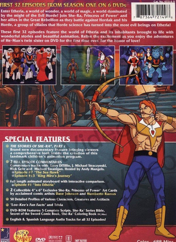 Cantidad de Discos: 6 | Lanzamiento: 1985 | Género(s): Animación | Audio: Inglés, Español | TÃtulo: She-Ra Princess of Power | Sub-CategorÃas: Animación | Norma / Región: 1 | Series: She-Ra | Cantidad de Discos: 6 | Lanzamiento: 1985 | Género(s): Animación | Audio: Inglés, Español | TÃtulo: She-Ra Princess of Power | Sub-CategorÃas: Animación | Norma / Región: 1 | Series: She-Ra