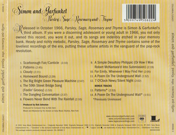 Artista(s) / Grupo: Simon & Garfunkel | Cantidad de Discos: 1 | Lanzamiento: 2001 | Género(s): Rock, Pop, Folk, World, & Country | Estilo(s): Folk Rock, Pop Rock | Título: Parsley, Sage, Rosemary & Thyme | Artista(s) / Grupo: Simon & Garfunkel | Cantidad de Discos: 1 | Lanzamiento: 2001 | Género(s): Rock, Pop, Folk, World, & Country | Estilo(s): Folk Rock, Pop Rock | Título: Parsley, Sage, Rosemary & Thyme