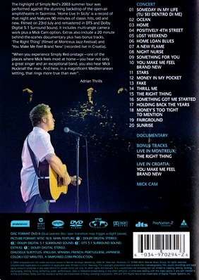 Artista(s) / Grupo: Simply Red | Cantidad de Discos: 1 | Lanzamiento: 2004 | Género(s): Electronic, Reggae, Funk / Soul, Pop | Estilo(s): Soul, Ballad | Título: Simply Red – Home (en vivo en Sicilia) | Norma / Región: NTSC (Región 1) | Artista(s) / Grupo: Simply Red | Cantidad de Discos: 1 | Lanzamiento: 2004 | Género(s): Electronic, Reggae, Funk / Soul, Pop | Estilo(s): Soul, Ballad | Título: Simply Red – Home (en vivo en Sicilia) | Norma / Región: NTSC (Región 1)