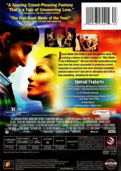 Cantidad de Discos: 1 | Lanzamiento: 2008 | Género(s): Drama | Audio: Inglés, Francés | SubtÃtulos: Francés, Español, Inglés | TÃtulo: Slumdog Millionaire | Director(es): Danny Boyle, Loveleen Tandan | Reparto: Dev Patel, Freida Pinto, Madhur Mittal, Anil Kapoor, Irrfan Khan, Saurabh Shukla, Mia Drake, Rajendranath Zutshi, Rubina Ali, Ayush Mahesh Khedekar | Norma / Región: NTSC 1 | Cantidad de Discos: 1 | Lanzamiento: 2008 | Género(s): Drama | Audio: Inglés, Francés | SubtÃtulos: Francés, Español, Inglés | TÃtulo: Slumdog Millionaire | Director(es): Danny Boyle, Loveleen Tandan | Reparto: Dev Patel, Freida Pinto, Madhur Mittal, Anil Kapoor, Irrfan Khan, Saurabh Shukla, Mia Drake, Rajendranath Zutshi, Rubina Ali, Ayush Mahesh Khedekar | Norma / Región: NTSC 1