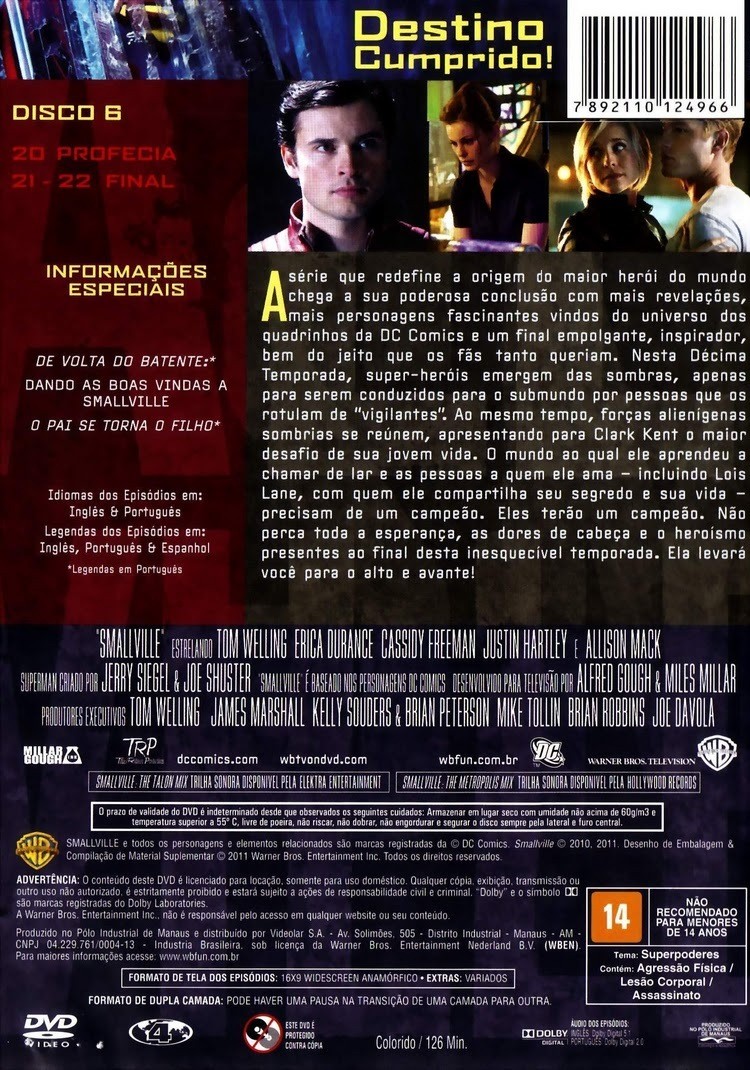 Cantidad de Discos: 6 | Lanzamiento: 2010 | Género(s): Serie de TV, Aventuras, Drama, Fantástico, Acción, Intriga | Audio: Inglés, Portugués | SubtÃtulos: Inglés, Español, Portugués, Francés, Chino | TÃtulo: Smallville 10 Temporada | Director(es): Tom Welling, Justin Hartley, Greg Beeman, Jeannot szwarc, Kevin Fair, James Marshall, Kelly Souders, Turi Meyer | Reparto: Tom Welling, Kristin Kreuk, Michael Rosenbaum, Allison Mack, John Schneider, Annette O’Toole, Erica Durance, John Glover, Sam Jones III, Aaron Ashmore, Justin Hartley, Eric Johnson, Camille Mitchell, Laura Vandervoort, Cassidy Freeman | Norma / Región: NTSC 4 | Cantidad de Discos: 6 | Lanzamiento: 2010 | Género(s): Serie de TV, Aventuras, Drama, Fantástico, Acción, Intriga | Audio: Inglés, Portugués | SubtÃtulos: Inglés, Español, Portugués, Francés, Chino | TÃtulo: Smallville 10 Temporada | Director(es): Tom Welling, Justin Hartley, Greg Beeman, Jeannot szwarc, Kevin Fair, James Marshall, Kelly Souders, Tur