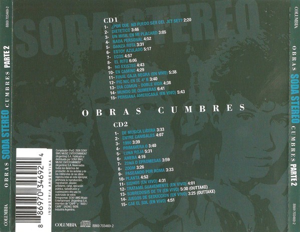 Artista(s) / Grupo: Soda Stereo | Cantidad de Discos: 1 | Lanzamiento: 2006 | Género(s): Rock | Estilo(s): Alternative Rock, Pop Rock, Arena Rock | TÃtulo: Obras Cumbres Parte 2 | Artista(s) / Grupo: Soda Stereo | Cantidad de Discos: 1 | Lanzamiento: 2006 | Género(s): Rock | Estilo(s): Alternative Rock, Pop Rock, Arena Rock | TÃtulo: Obras Cumbres Parte 2