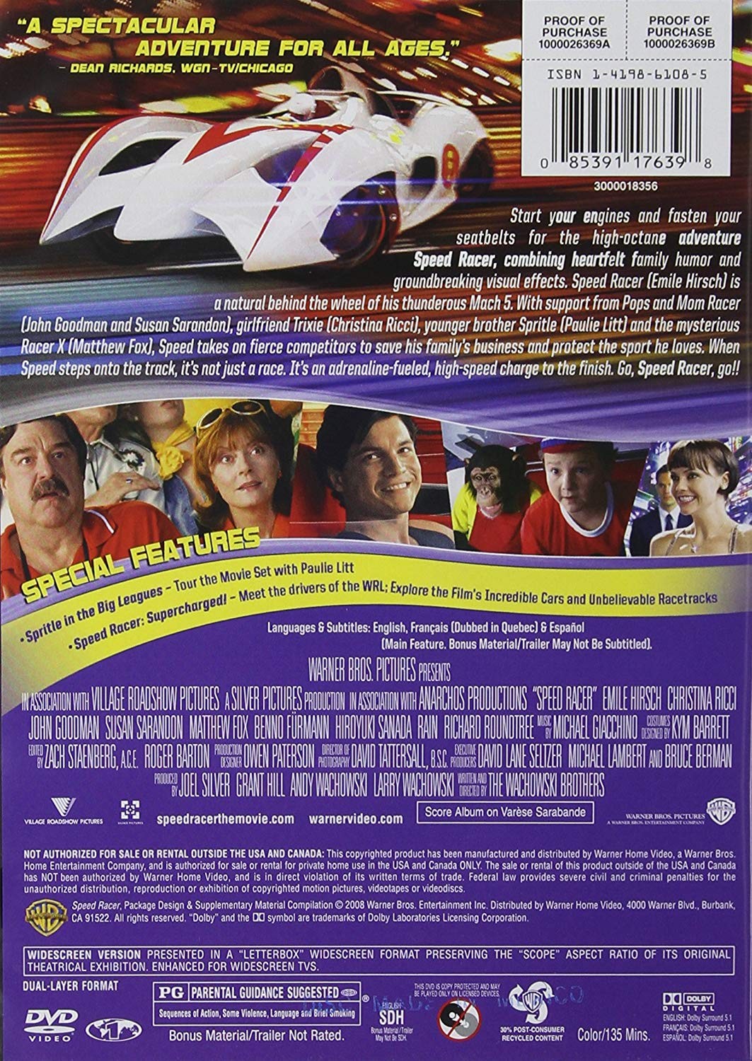 Cantidad de Discos: 1 | Lanzamiento: 2008 | Género(s): Acción, Ciencia Ficción | Audio: Inglés, Francés, Español | SubtÃtulos: Inglés, Francés, Español | TÃtulo: Speed Racer | Director(es): Hermanas Wachowski | Reparto: Emile Hirsch, Matthew Fox, Susan Sarandon, John Goodman, Christina Ricci, Roger Allam, Scott Porter, Kick Gurry, Rain, Park Joon Hyung, Nicholas Elia | Norma / Región: NTSC (Región 1, 4) | Cantidad de Discos: 1 | Lanzamiento: 2008 | Género(s): Acción, Ciencia Ficción | Audio: Inglés, Francés, Español | SubtÃtulos: Inglés, Francés, Español | TÃtulo: Speed Racer | Director(es): Hermanas Wachowski | Reparto: Emile Hirsch, Matthew Fox, Susan Sarandon, John Goodman, Christina Ricci, Roger Allam, Scott Porter, Kick Gurry, Rain, Park Joon Hyung, Nicholas Elia | Norma / Región: NTSC (Región 1, 4)
