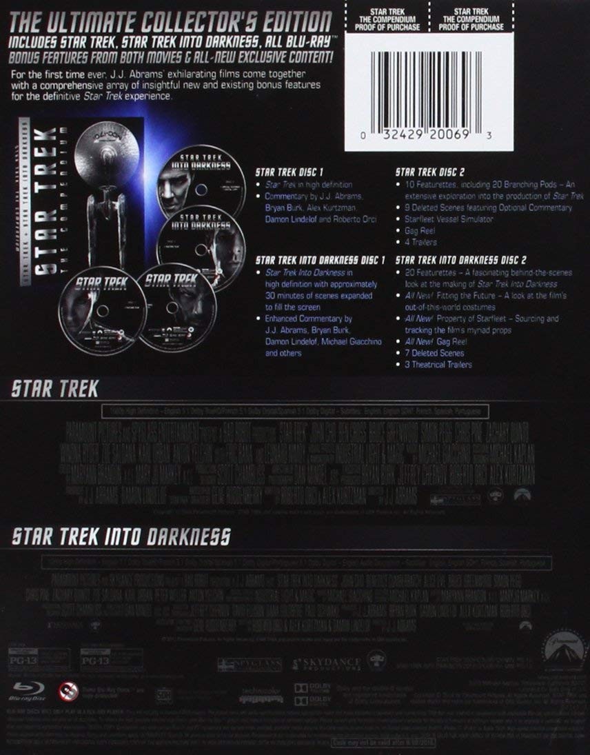 Cantidad de Discos: 4 | Lanzamiento: 2014 | Género(s): Acción, Aventuras | Audio: Inglés (Dolby Digital 5,1), Español (Dolby Digital Stereo, Dolby Digital 5,1), Francés (Dolby Digital Stereo, Dolby Digital 5,1) | Subtítulos: Inglés, Español, Francés, Portugués | Título: Star Trek XI) (2009) / Star Trek: En la oscuridad (2013) | Director(es): J.J. Abrams | Reparto: Chris Pine, Zachary Quinto, Zoe Saldana, Eric Bana, Simon Pegg, Karl Urban, Bruce Greenwood, Anton Yelchin, John Cho, Leonard Nimoy, Winona Ryder, Ben Cross, Chris Hemsworth, Jennifer Morrison, Rachel Nichols, Jimmy Bennett, Faran Tahir, Clifton Collins Jr., Tyler Perry, James Cawley, Wil Wheaton, Oz Perkins /