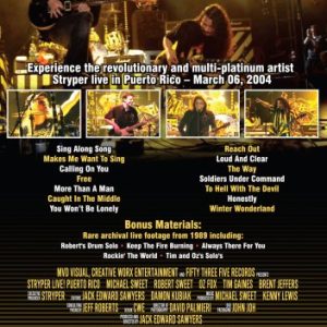 Experimente a los revolucionarios artistas multiplatino de Stryper, en vivo en Puerto Rico, el 6 de marzo de 2004. La banda se formó originalmente en el condado de Orange, California, por los hermanos Michael y Robert Sweet y el guitarrista Oz Fox. Stryper significa Salvación a través de la redención que produce paz, aliento y rectitud. Isaías 53:5 debajo de su logo se refiere al versículo bíblico que dice «por sus llagas fuimos sanados». La banda se ganó su fama en el circuito de clubes de metal de Los Ángeles y en 1984 vendió millones de discos en todo el mundo. ¡Este DVD presenta todos sus grandes éxitos y mucho más!