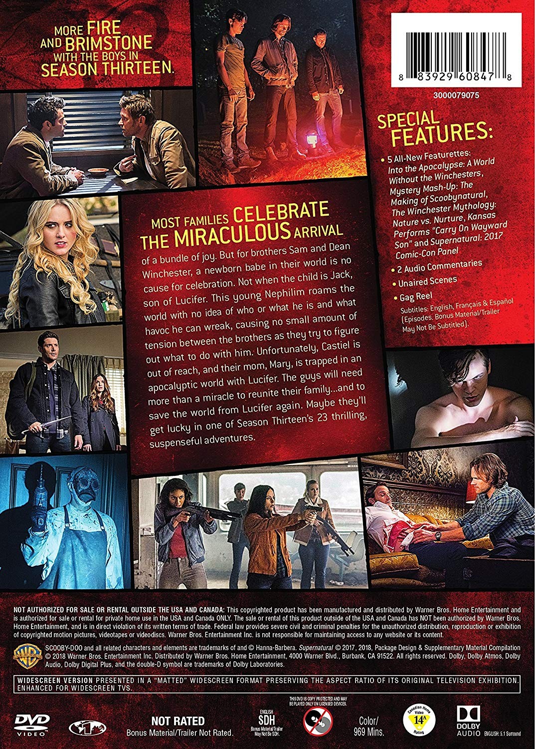 Cantidad de Discos: 5 | Lanzamiento: 2018 | Género(s): Serie de TV, Ciencia ficción, Drama | Audio: Inglés | SubtÃtulos: Español, Inglés, Francés | TÃtulo: Supernatural – S13 | Director(es): Phil Sgriccia | Reparto: Jared Padalecki, Jensen Ackles, Katie Cassidy, Lauren Cohan | Norma / Región: NTSC 1 | Cantidad de Discos: 5 | Lanzamiento: 2018 | Género(s): Serie de TV, Ciencia ficción, Drama | Audio: Inglés | SubtÃtulos: Español, Inglés, Francés | TÃtulo: Supernatural – S13 | Director(es): Phil Sgriccia | Reparto: Jared Padalecki, Jensen Ackles, Katie Cassidy, Lauren Cohan | Norma / Región: NTSC 1