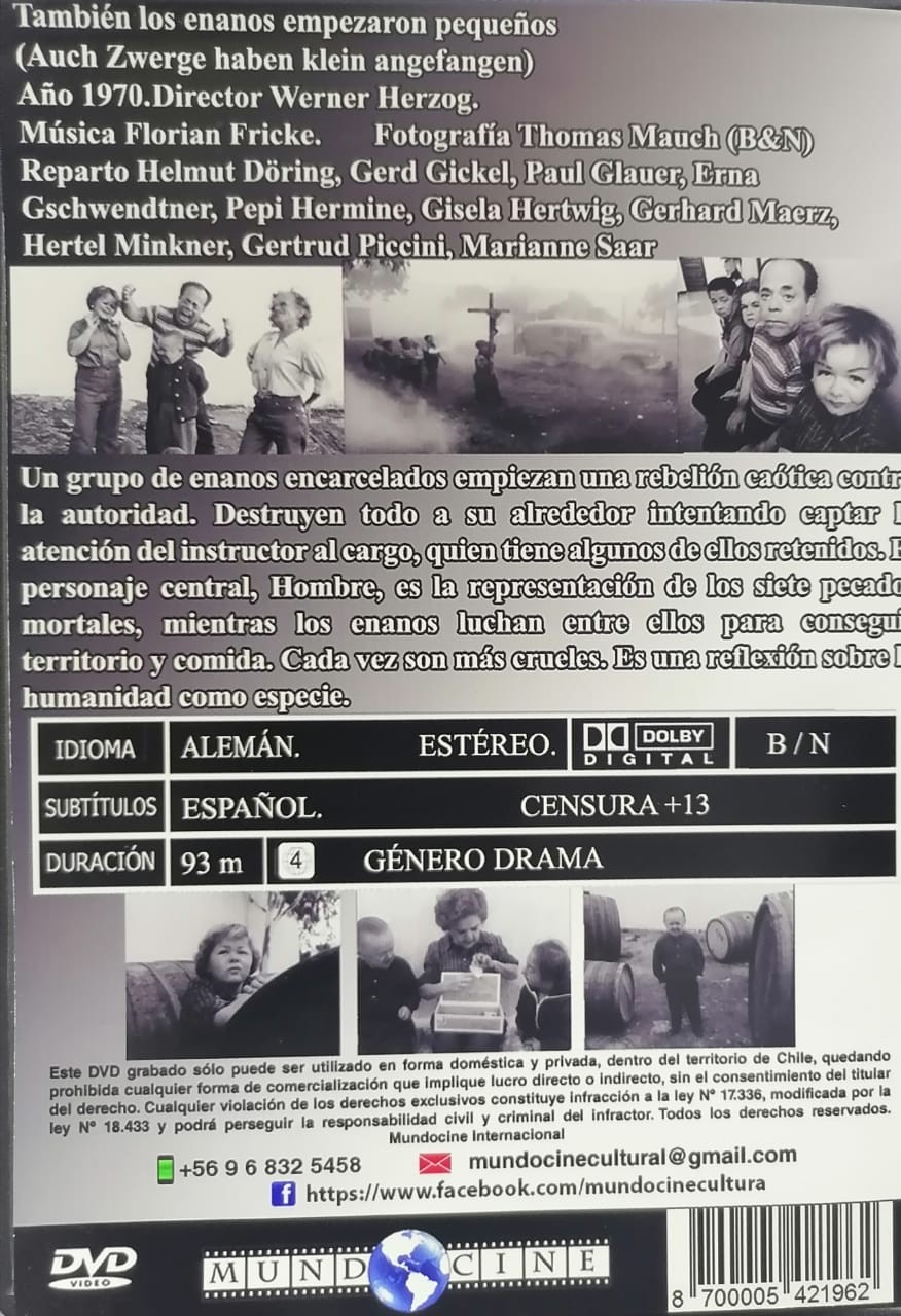 Cantidad de Discos: 1 DVD | Lanzamiento: 1970 | Género(s): DRAMA | Audio: ALEMAN | Subtítulos: ESPAÑOL | Título: Auch Zwerge haben klein angefangen | Director(es): Werner Herzog | Reparto: Helmut Döring, Gerd Gickel, Paul Glauer, Erna Gschwendtner, Pepi Hermine, Gisela Hertwig, Gerhard Maerz, Hertel Minkner, Gertrud Piccini, Marianne Saar | Norma / Región: DISCO QUEMADO , ZONA 4 | Cantidad de Discos: 1 DVD | Lanzamiento: 1970 | Género(s): DRAMA | Audio: ALEMAN | Subtítulos: ESPAÑOL | Título: Auch Zwerge haben klein angefangen | Director(es): Werner Herzog | Reparto: Helmut Döring, Gerd Gickel, Paul Glauer, Erna Gschwendtner, Pepi Hermine, Gisela Hertwig, Gerhard Maerz, Hertel Minkner, Gertrud Piccini, Marianne Saar | Norma / Región: DISCO QUEMADO , ZONA 4