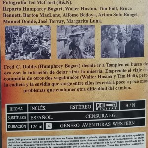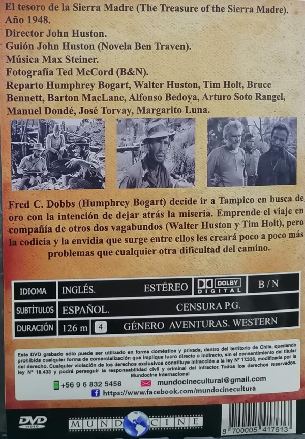 Cantidad de Discos: 1 DVD | Lanzamiento: 1948 | Género(s): WESTERN | Audio: INGLES | SubtÃtulos: ESPAÑOL | TÃtulo: The Treasure of the Sierra Madre | Director(es): John Huston | Reparto: Humphrey Bogart, Walter Huston, Tim Holt, Bruce Bennett, Barton MacLane, Alfonso Bedoya, Arturo Soto Rangel, Manuel Dondé, José Torvay, Margarito Luna | Norma / Región: DISCO QUEMADO , ZONA 4 | Cantidad de Discos: 1 DVD | Lanzamiento: 1948 | Género(s): WESTERN | Audio: INGLES | SubtÃtulos: ESPAÑOL | TÃtulo: The Treasure of the Sierra Madre | Director(es): John Huston | Reparto: Humphrey Bogart, Walter Huston, Tim Holt, Bruce Bennett, Barton MacLane, Alfonso Bedoya, Arturo Soto Rangel, Manuel Dondé, José Torvay, Margarito Luna | Norma / Región: DISCO QUEMADO , ZONA 4
