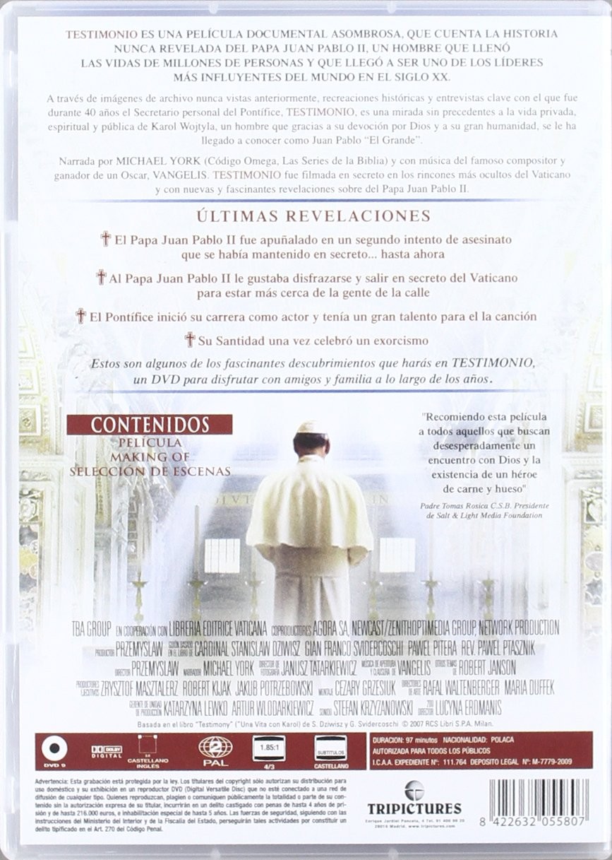 Cantidad de Discos: 1 DVD | Lanzamiento: 2009 | Género(s): Documental, Religioso | Audio: Español, Inglés | Subtítulos: Español | Título: Testimony: The Untold Story of Pope John Paul II | Director(es): Paweł Pitera | Norma / Región: PAL 2 | Cantidad de Discos: 1 DVD | Lanzamiento: 2009 | Género(s): Documental, Religioso | Audio: Español, Inglés | Subtítulos: Español | Título: Testimony: The Untold Story of Pope John Paul II | Director(es): Paweł Pitera | Norma / Región: PAL 2